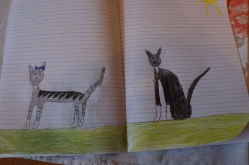 Moja wnuczka pierwszoklasistka przysłała babci narysowane nasze domowe koty.Ta z kokardka to Luśka i Micek.