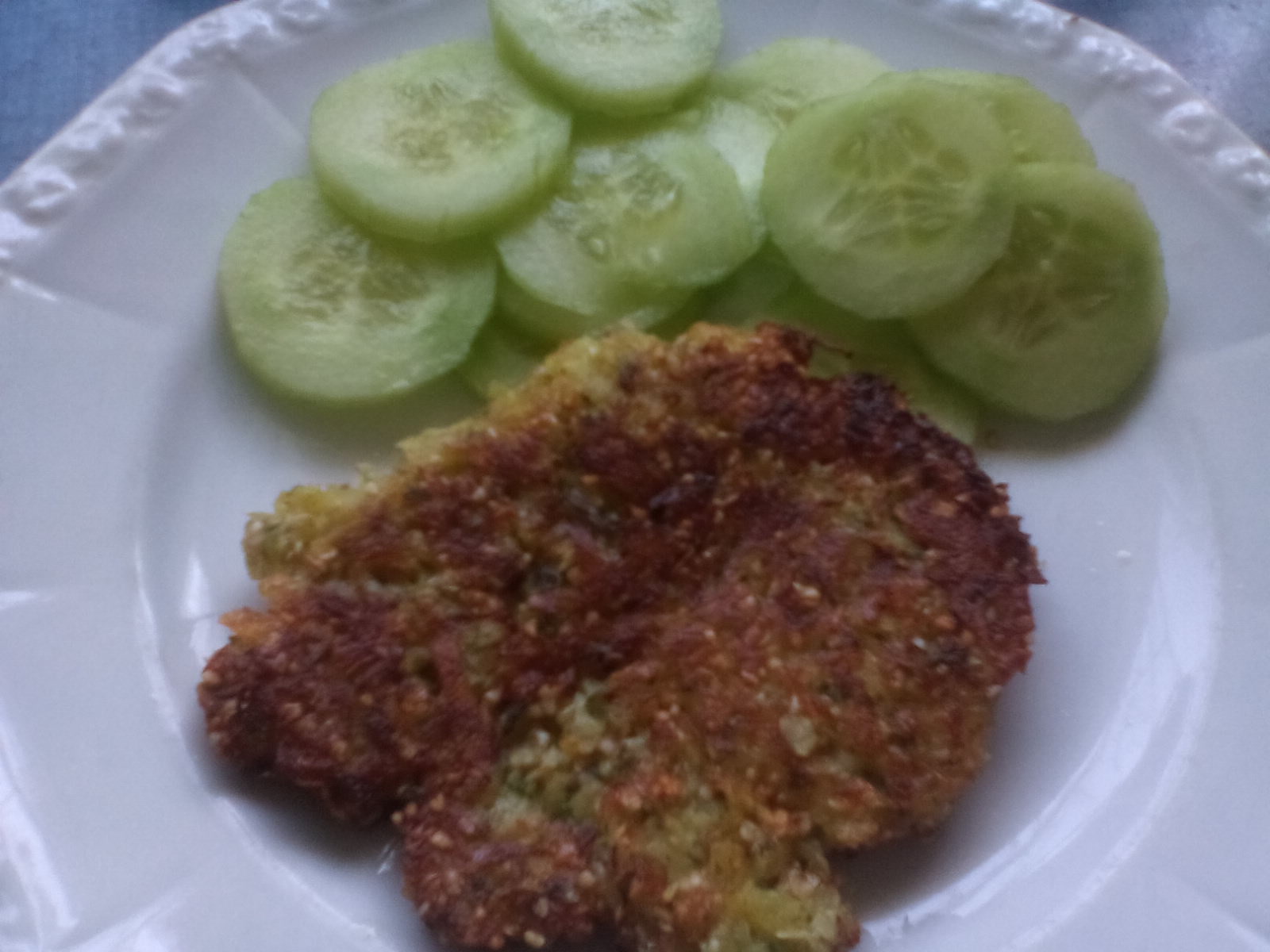 Dodawałam do placuszków co mi pod rękę wpadło potarłam nawet trochę kalarepki, dodałam zioła mrożone ,które kupuje w Aldiku. Taka mieszanka 8 ziół. A na koniec otręby gryczane i smażyłam małe placuszki na oleju. Pdp jadła z Apfelmusem a ja z ogórkiem zielonym mniam....:gotowanie: