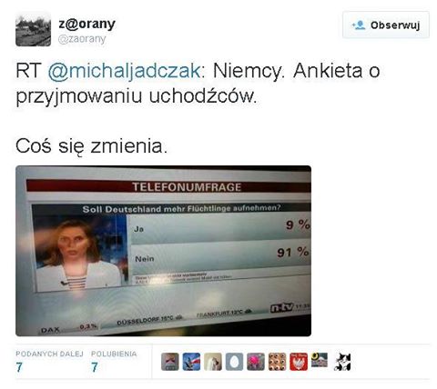 Jak zwykle duzo gadki w mediach. Jest to niedobre co teraz napisze, ale przez ta cala sytuacje z uchodzcami, zaczynam zauwazac u siebie oznaki rasizmu:( Nie jestem przeciwna temu, aby pomoc ludziom w potrzebie, ale wiekszosc tych przybywajacych tutaj , to mlodzi mezczyzni. Kiedy czytalam artykol , gdzie wypowiada sie facet i mowi , ze ma jaja spuchniete , bo nie moze przyprowadzic do siebie kobiety, no wybaczcie.... jasna cholera w sytuacji zalamania psychicznego, strachu, nowego ladu, po przezyciu drogi do tego raju, kto bedzie myslal o seksie???? moze jestem nietypowa, lubie seks , ale w takiej sytuacji nic by mnie nie ruszylo. O co wiec w tym wszystkim chodzi? o cos , co za zgoda nienormalnych politykow , mozna w bardzo latwy sposob osiagnac.