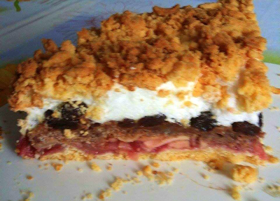 Przepis na skubańca. 0,5kg mąki,1kostka masła rozpuścić,3łyżeczki proszku,5 żółtek,zagnieść te składniki i podzielić na 3 części.Jedną częścią wylepić blaszke na to 1słoik dżemu i wiśnie z kompotu na to dajemy drugą czesc ciasta ale najpierw dodajemy do tego ciasta 2 łyżki kakao.Nastepnie na ta brazowe ciasto dodajemy orzechy,rodzynki i ubita piane z białek ze szklanka cukru .Na ta piane pokruszyć trzecia czesc ciasta pieczemy 40minuy 180stopni.Po wystygnięciu zrobić polewe,Pół kostki masła 4 łyżki cukru 2łyżki kakao 2 łyżki wody zagotować polewac gorącą polewą .Smacznego.