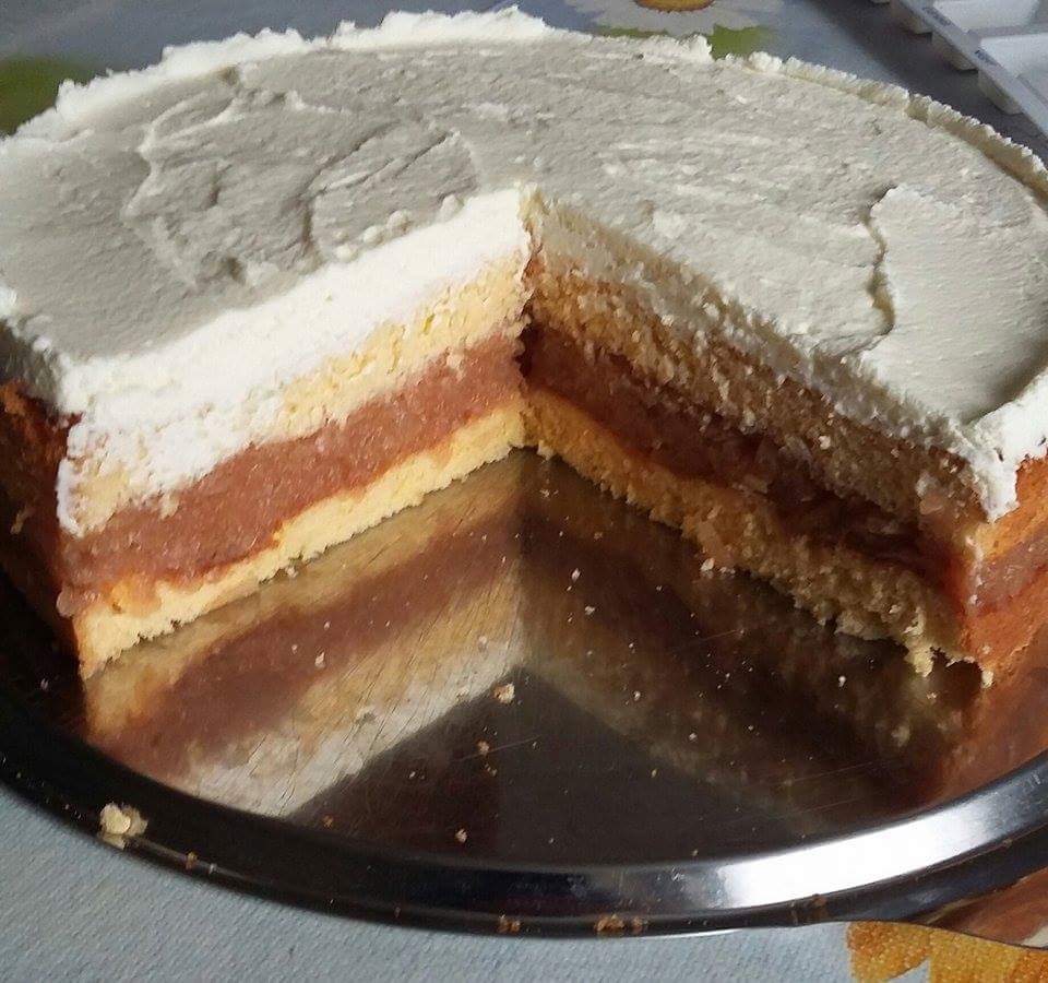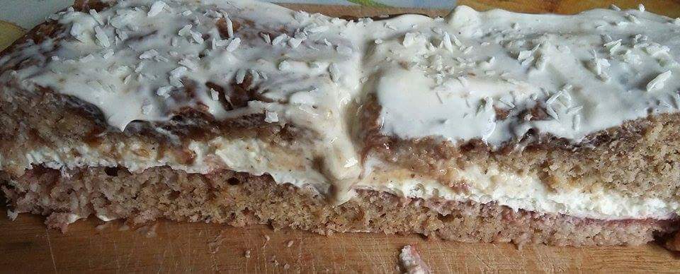 Przeciąć placek na pół, nasączyć obie połówki np. przegotowaną wodą z cukrem i spora ilością soku z cytryny. 1 placek posmarować kremem i przykryć drugim. Polać polewą i posypać wiórkami kokosowymi.