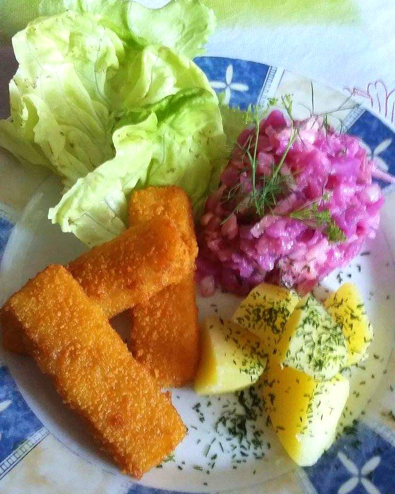 Dziś mam lenia, więc na obiad paluszki rybne, ziemniaki i surówka z czerwonej kapusty.