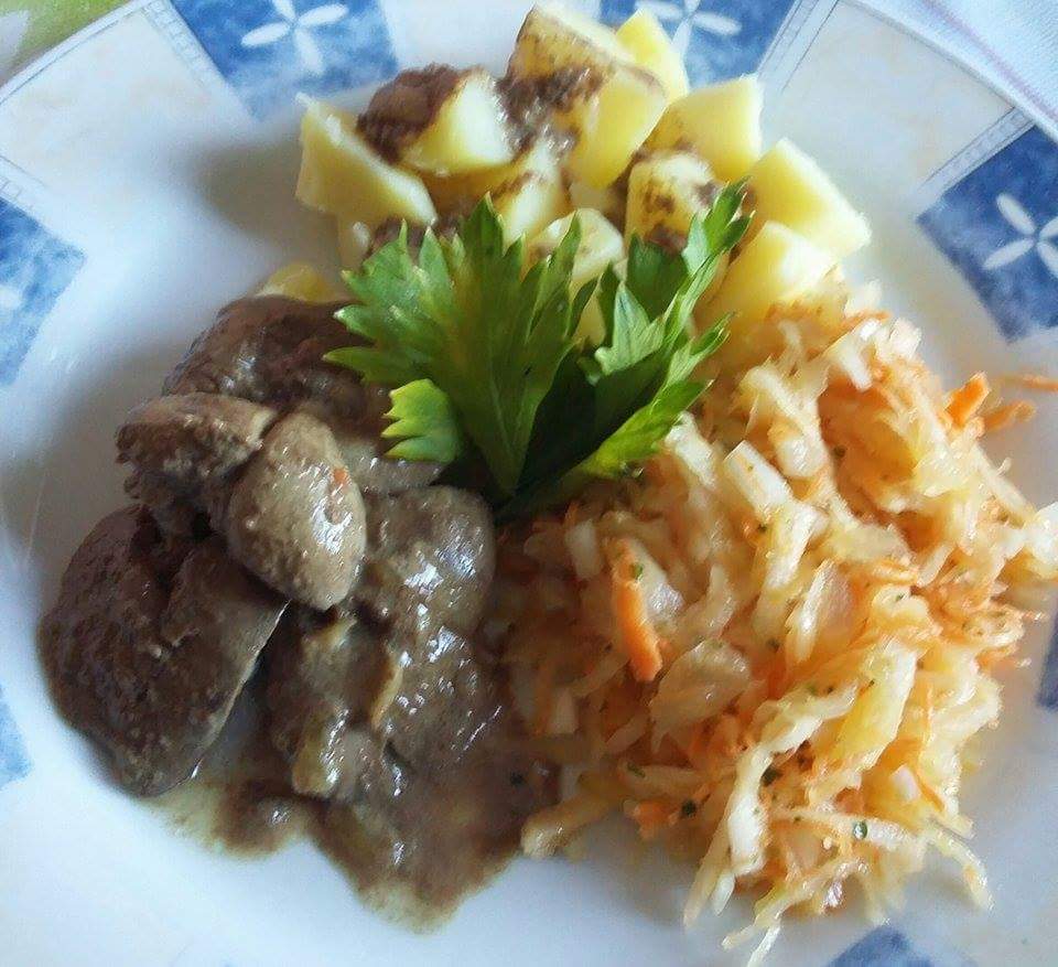 Dzis watrobka z kurczecia, surowka z kiszonej kapusty, ziemniaki bez soli.