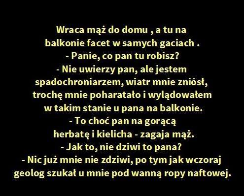 Nigdy nie zrozumiem ludzi. Mój kumpel był smutny, bo jego żona nie uprawia seksu analnego. Jak mu powiedziałem, żeby się nie martwił, bo jednak uprawia, to posmutniał jeszcze bardziej.