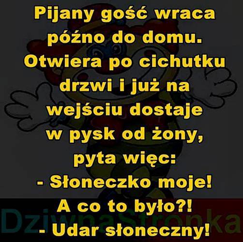 Pijany facet wraca do domu. Żona zaczyna awanturę i wymownie pokazuje palcem na zegarek. Na co facet: