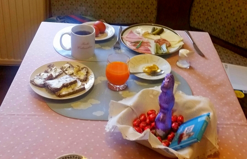 Dziś szybko i bez wysiłku: pierś panierowana,kartofle gotowane,zielona sałata ze szczypiorem,rzodkiewką i jajem,polana jogurtem z miodem i cytryną.Na deser pudding z kompotem z rabarbaru.