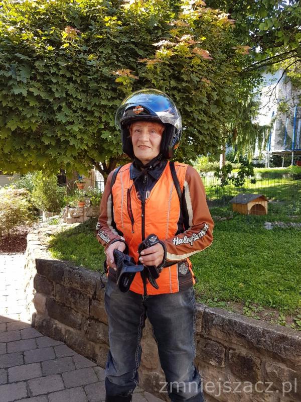 Dzień z grillem i przejażdżką Harley - em... Pan doktor psychiatrii (syn mojej pdp) chciał się pochwalić praktyką i powiózł mnie tam swoim motorem... Byłam odziana w pełny uniform też od Harley - a (jego żony), ciężkie to, ale później się z tego tylko cieszyłam... :lol2: Nie czułam się w pełni bezpieczna i przez pierwsze 500 m miałam mocno zamknięte oczy... :lol2: Później pomyślałam sobie, że głupio tak jechać i nic nie widzieć... To otworzyłam te oczęta i byłam bardzo zdziwiona, że nie widzę swojej duszy na ramieniu, a na pewno tam była... :lol2: Przejażdżka to jakieś 40 km... Fajnie było bo wszyscy się na nas gapili, a myślałam, że Harley to tylko w Polsce powód do dumy... :-) Pan doktor sprawdzał moja wytrzymałość bo choć miało być "po malutku" to ciał na prostych ile fabryka dała, no może nie całkiem... :lol2: Później powiedział, że jestem odważna... :lol2: Co on tam wie... na motor już więcej nie usiądę, choćby to i Harley był... :lol1:
