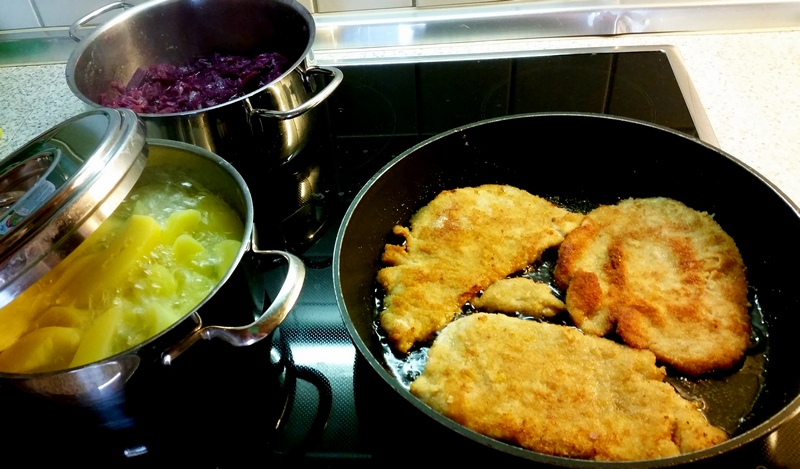 Znów Konigsbergeklopse,tym razem kupne-w jakiejś, ponoć wypasionej garmażerce ,z kaparami,oliwkami,cuda wianki na kiju-no cóż,nieskromnie powiem,że te moje były lepsze:)Do tego ziemniaki i mizeria.Sok marchwiowy.