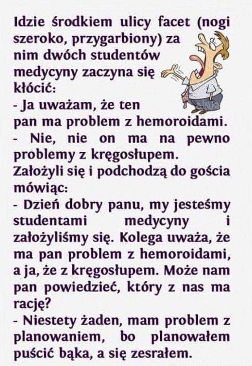Mąż do żony"kochanie idę odebrać aparat słuchowy, po drodze wstąpię do apteki.." po godzinie wraca..żona pyta i co jak działa?lepiej już słyszysz? Przyniosłeś mi tabletki, kupiłeś sobie czopki od bólu.M: "słucham ?co mowisz? Żona powtarza....M: poczekaj bo muszę odkleić te aparaty, a i coś te czopki jakieś bardzo twarde.....