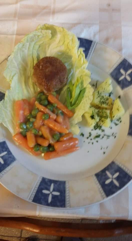 Świnkowe mięsko w sosie ( cebulkę dam ,a i winkiem podleję) sałata lodowa z cykorią i innymi warzywami w sosie jogurtowo- śmietanowym oraz nieśmiertelne Semmelknödel.:-)