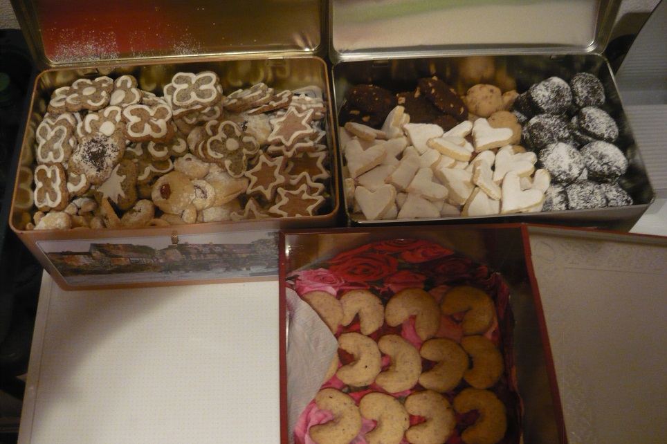 Zrobiłam zdjęcie mojej produkcji tygodniowej,na którą zużyłam około 3 kg mąki i około 6 kostek masła.Nie są ładnie wyeksponowane,ponieważ znajdują się w pancernych puszkach,schowane przed dziadkiem łakomczuszkiem.:-)