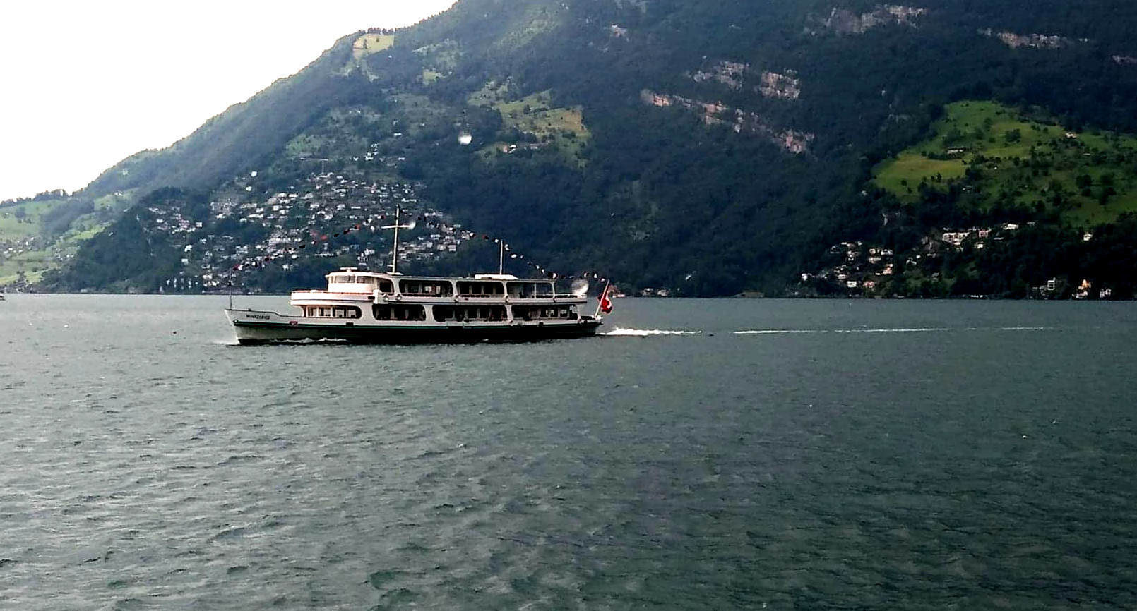 Dobry wieczór Ludzie. Wcięło, bo się szwendaczka włączyła. Trzeba było jeszcze parę miejsc przed wyjazdem do domu zobaczyc. Dziś była 3 godzinna runda parostatkiem po Jeziorze Czterech Kantonów , ale w stronę Rigi. Odprężające bardzo, a i pogoda sprzyjała zdjęciom, bo było raz burzowo, a raz słonecznie i pośród ciemnych chmur było widać jasno oświetlone szczyty. Przerzucam zdjęcia i filmy z karty SD. Jeden filmik już na jutuba załadowałam. Jeden z przystanków na trasie statku:
