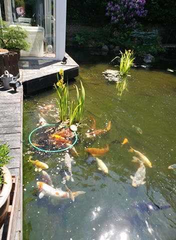 Tu są takie sznurki wysoko- żeby nic im na te ryby nie polowało. A one tak do jedzenia się ruszyły- w tę obręcz się sypie.