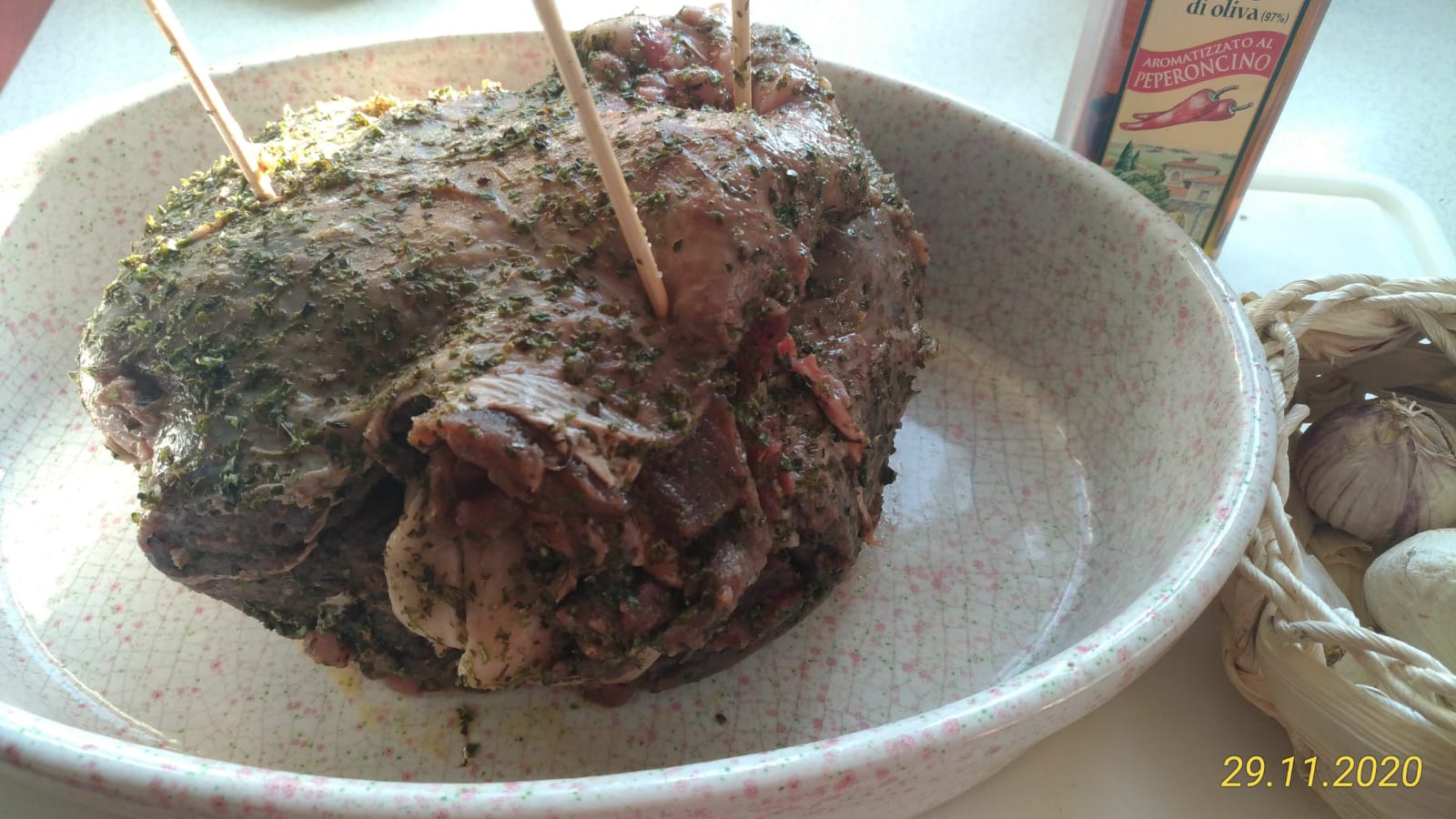 Zaraz idzie do piekarnika- po wylegiwaniu się 24 h w czerownym winie został dziku natarty przyprawami,olivą pepperoni oraz naszpikowany czosnkiem i szpekiem bardzo delikatnie...