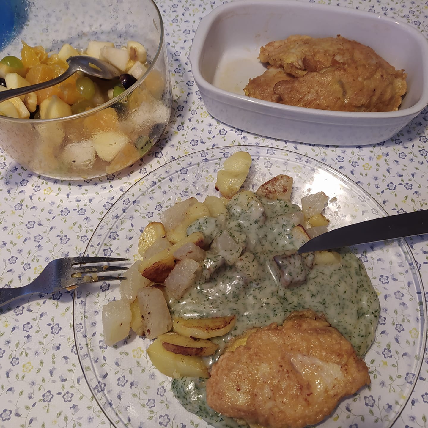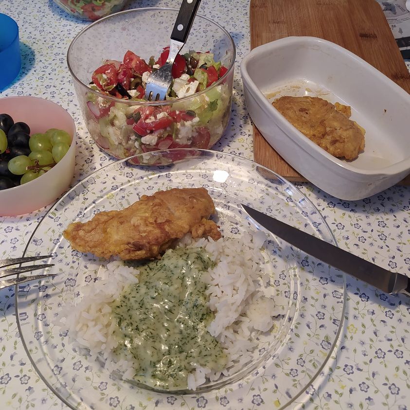 Dziś powtórka z rozrywki - czyli kotleciki z piersi indyka, sos koperkowy, ale w wariacji z ryżem. A sałatka wielowarzywna z oliwkami, serem fetą i ziarenkami sałatkowymi. Na deser winogronka.:mniam: