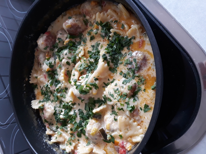 . Klopsiki ze schabu, z warzywami, z makaronem, w sosie serowym, wszystko w jednym garnku, a właściwie na nowej, głębokiej patelni.