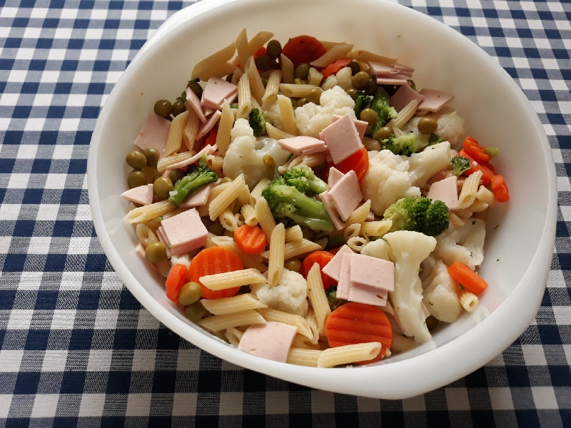 Zapiekanka makaronowa z warzywami i wurstem szynkowym, ,może jeszcze sałata jeśli babcia będzie chciała, na deser jogurt grecki z miodem. Zapiekanka właśnie się przygotowuje