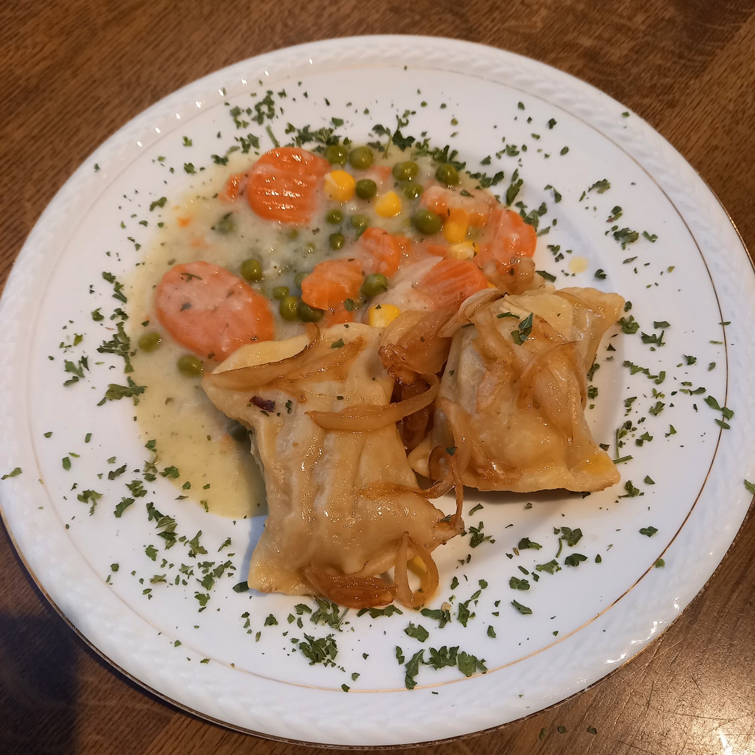 Marchewka z groszkiem + Rindfleisch Maultaschen + cebulką lekko zarumienionaą z masełkiem na patelni by te taschen polać .Niby nic ale dobre.A na deser maliny i tylko mały kleks z bitej śmietany bo do kawy gruszkowe ciacho z adwokatem ?
