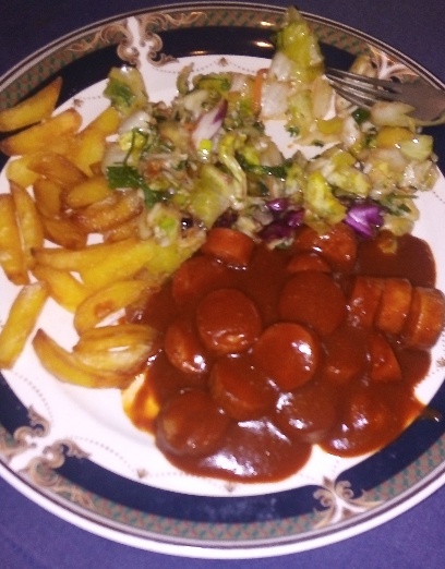 Currywurst - gotowiec, fryty i sałatka - samodzielnie przyrządzone.