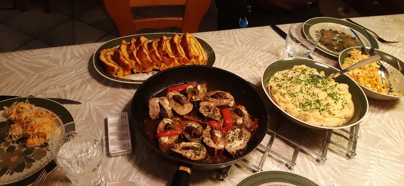 U nas sałata mieszana, z burakami, fetą i dressingiem, gęsta,bardzo aromatyczna zupa z czerwoną soczewicą ,posypana świeżą kolendrą. Pomieszane soki z buraków, jabłek z mineralką. Deseru nie było, żadna już nie miała na niego miejsca ?. Zrobiłam michę sałaty i wszystko poszło.