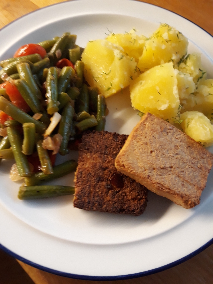 Ziemniaki z koperkiem, fasolka zielona, część taka jaką zna babcia, czyli z wody, a część może z masłem i bułeczką tartą, albo z cebulką i pomidorkami koktajlowymi. I wegetarianskie bratlinge z...tofu :-(. Chyba sobie sadzone zrobię ?. Ale najpierw spróbuję tego "ichniego" przysmaku. Jak przekonać moje dziewczyny, że bez tych gotowców też można znaleźć produkty bogate w Eiweiß? Jakieś podpowiedzi? Może "MZap w kuchni " coś doradzi?