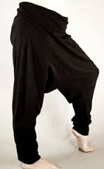 Są dwa rodzaje spodni o tej nazwie, te drugie są z normalnym krokiem ale z szerokimi nogawkami ze ściągaczem na dole. Kasia nie oglądałaś baśni 1001 nocy? Alladyn, Sindbad, Alibaba 40 rozbójników? Oni tam wszyscy w tych spodniach śmigali ;-)