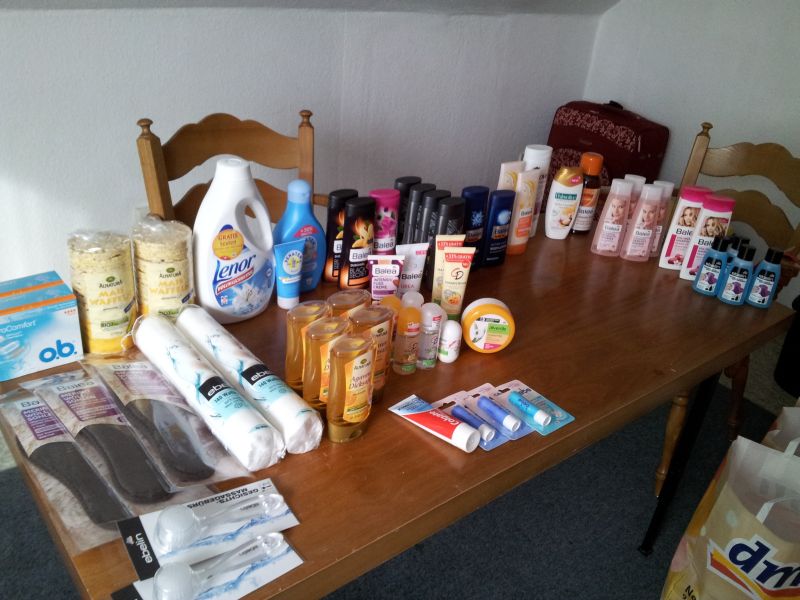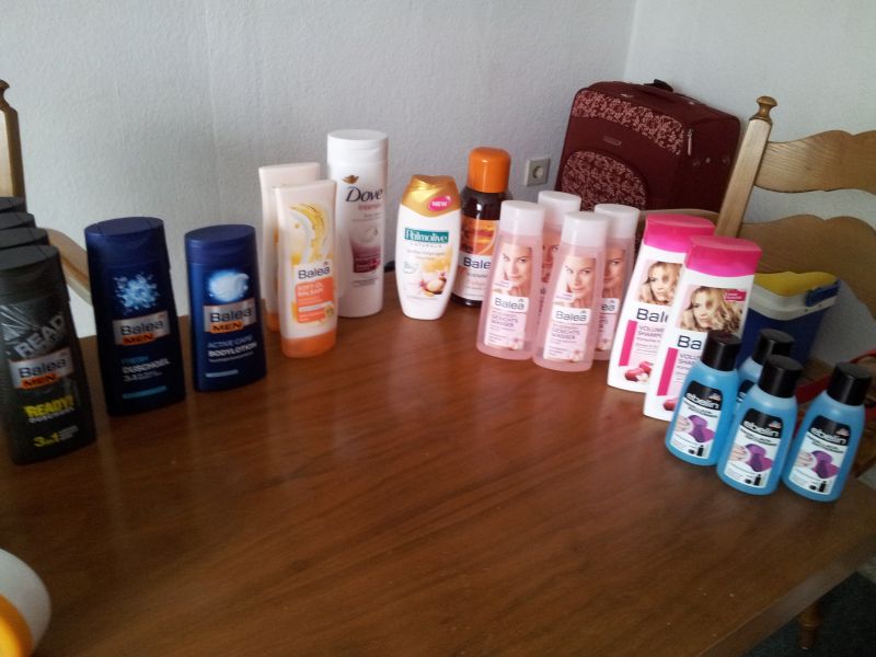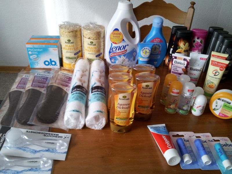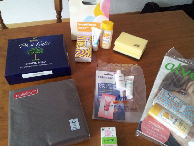 Na samym końcu sfotografowane są gratisy, które zdobyłam:) Wszystko z DMu, tylko kawa z K+K. Można było zakręcić kołem fortuny i udało mi się wygrać nagrodę główną - 500 gram kawy brazylijskiej Tschibo.