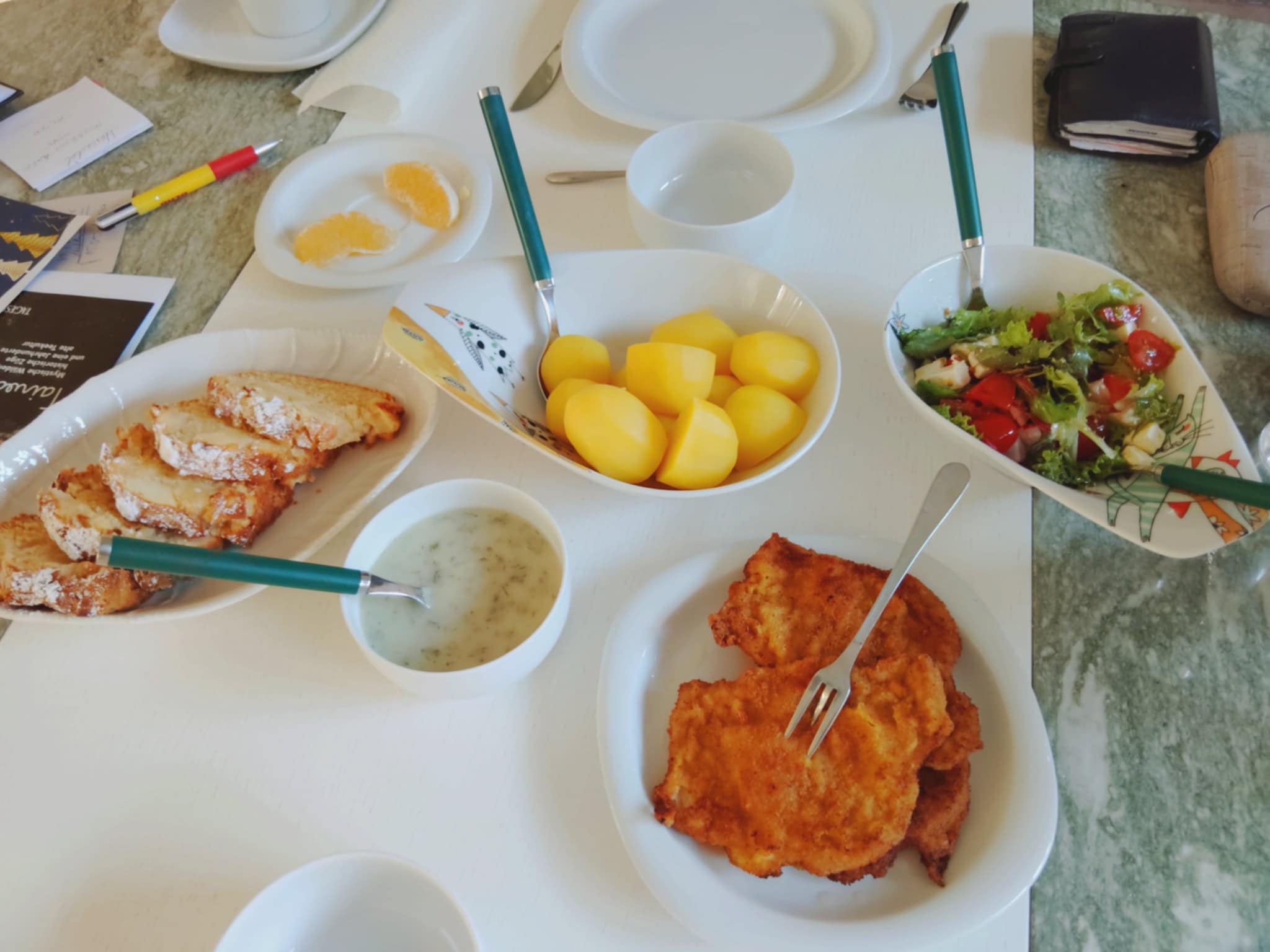 Dziś schabowe, saltzkartofel, sos koperkowy, sałatka a'la grecka. A na deser jeszcze ciepły keks jabłkowy:mniam: