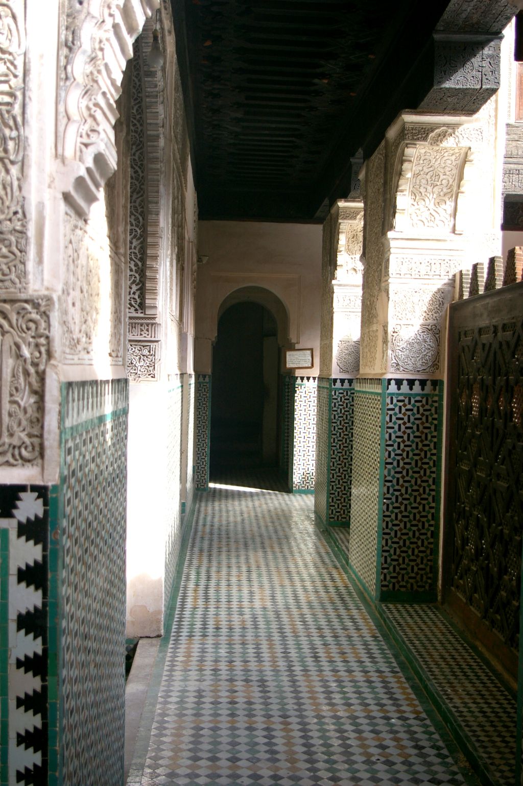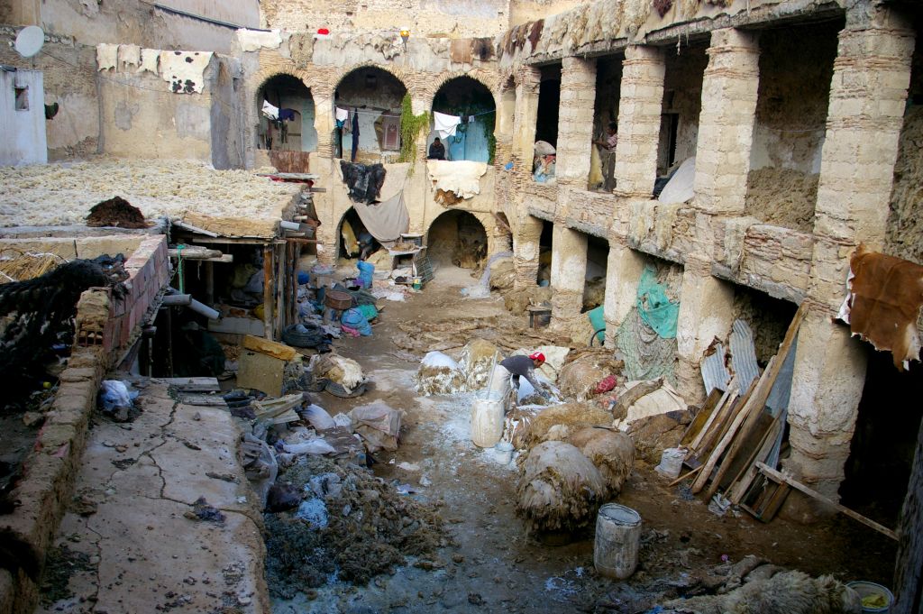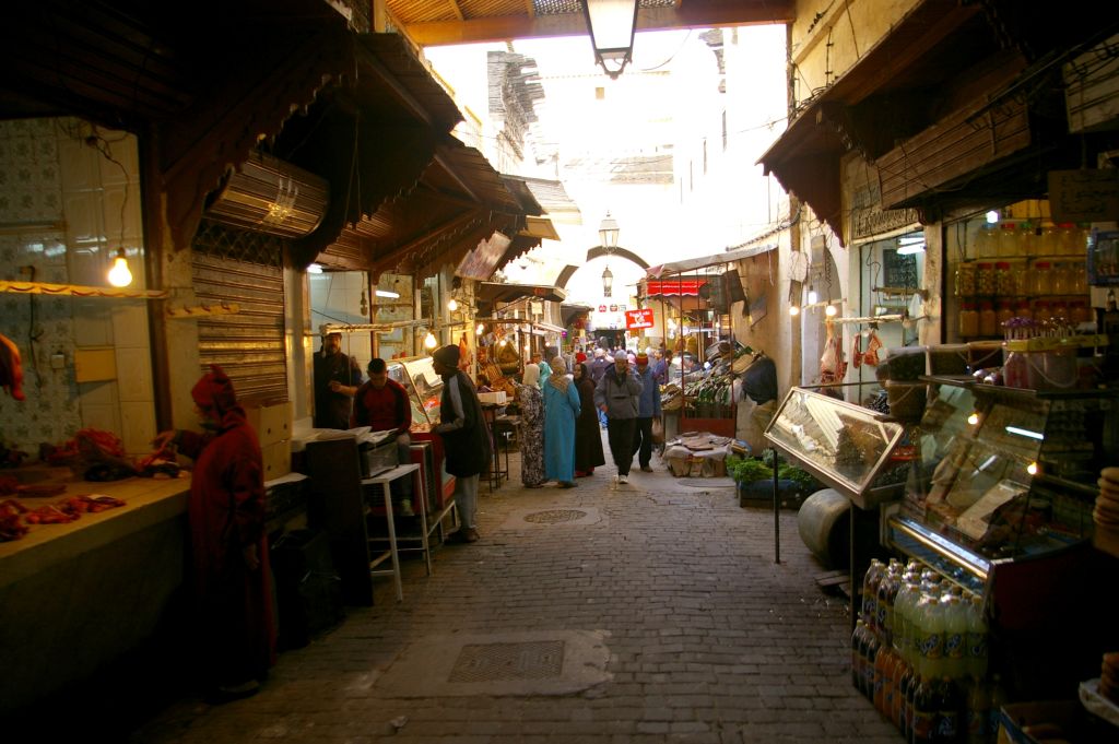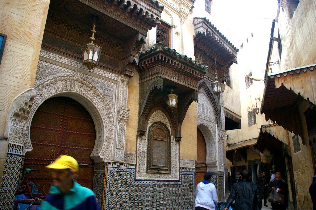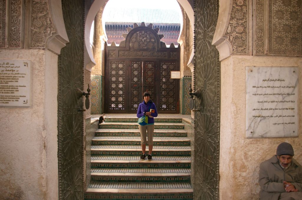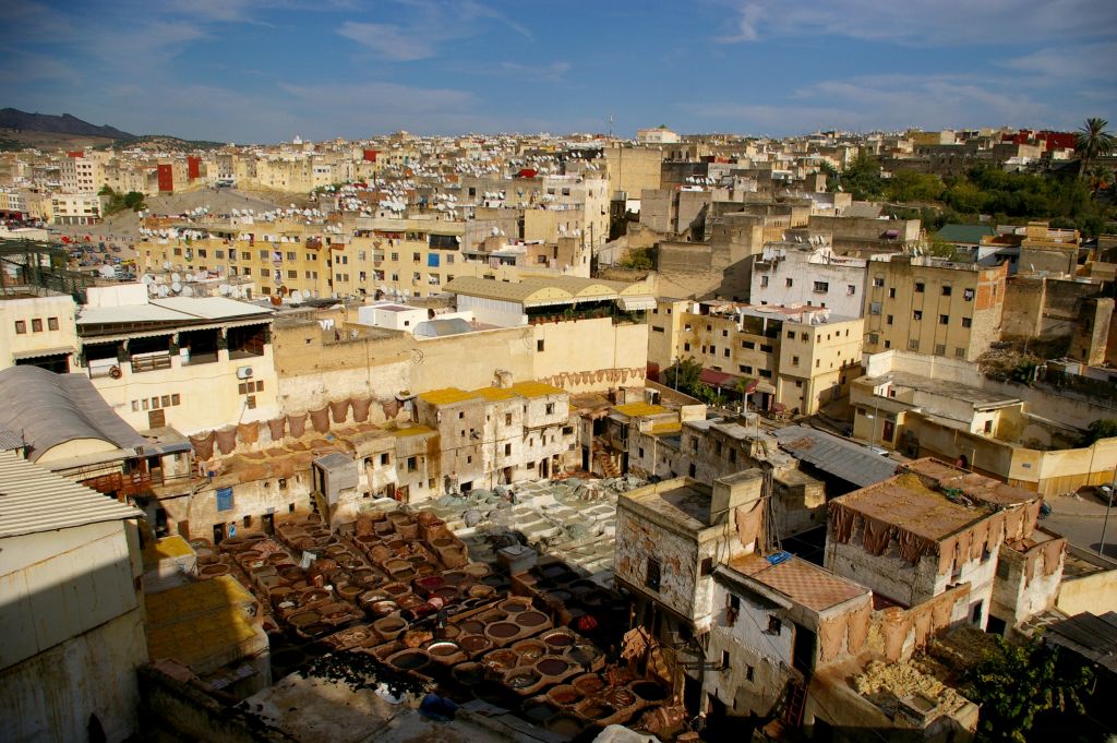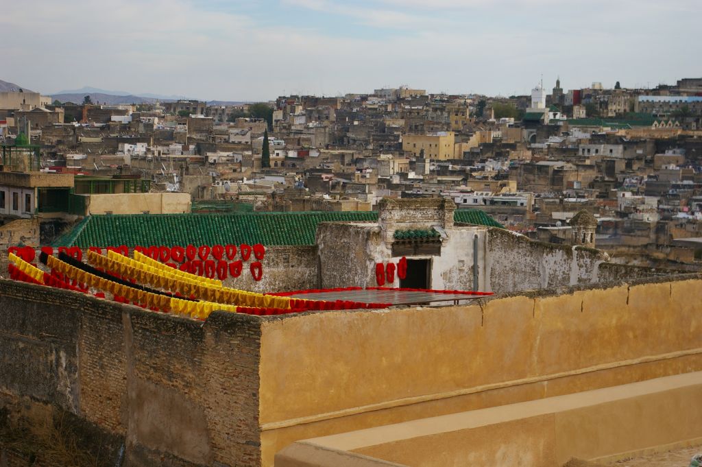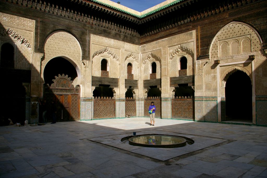Po zajechaniu do Fezu musieliśmy znaleźć nocleg. Z dworca mieliśmy całkiem blisko do placu Bu Dżalud, gdzie miało być zagłębie tanich hoteli. Jak zawsze dopadli nas naganiacze i byli tak przekonywujący, że obejrzeliśmy z nimi kilka pensjonatów. Jeden był całkowicie zapełniony, ale drugi miał wolne pokoje. Chcieli od nas 200 dirhamów za noc, ale powiedziałam od razu stanowczo, że albo 150, albo idziemy do innego hotelu. Niby nie chcieli, więc już wychodziliśmy, kiedy nas dogonili i jednak się na tą cenę zgodzili. I tak mamy tutaj 2 noce zostać, ale może i sobie przedłużymy. W naszym pensjonacie na dole mieszka rodzina, a pokoje dla gości rozłożone są na górze, wokół patio. Jak na razie to najlepszy nasz pokój, bo jest zupełnie czysty – do niczego nie można się przyczepić. No i mamy ładne, duże, drewniane łoże, czyste i puszyste koce, ładną łazienkę. Wprawdzie jak się wprowadzaliśmy do pokoju, to jakiś Arab mył w naszej łazience zęby… no cóż – co kraj, to obyczaj:)