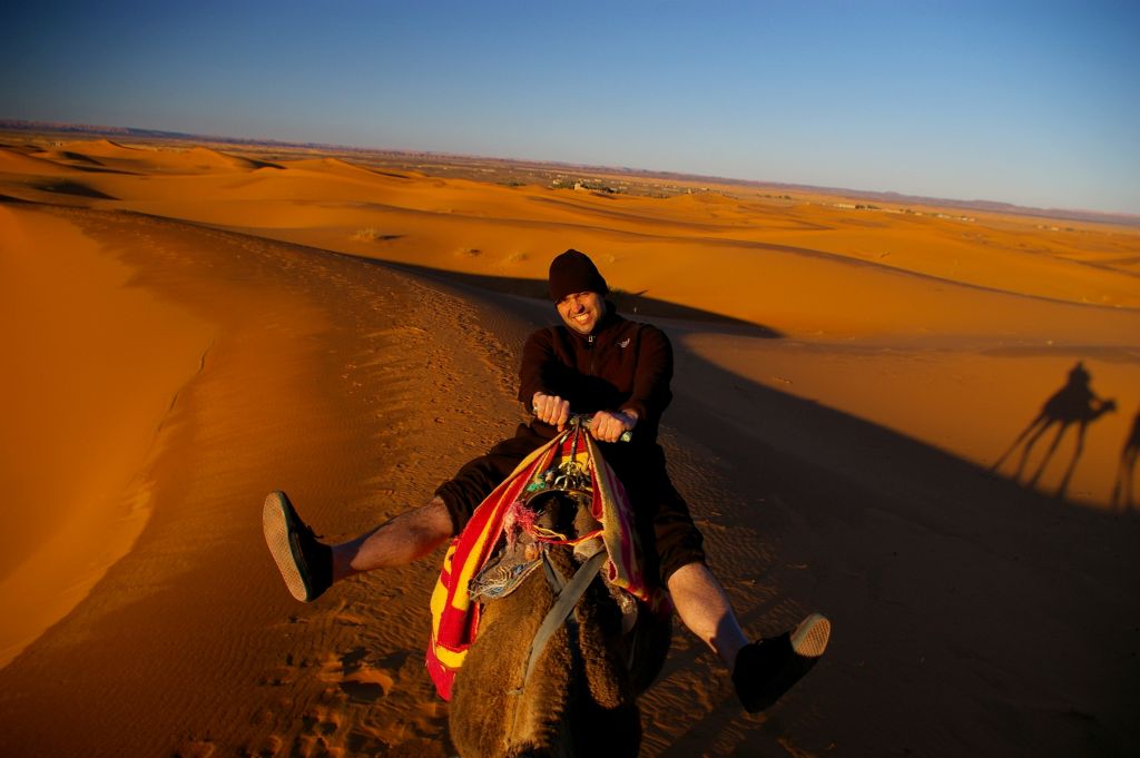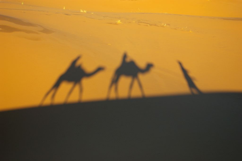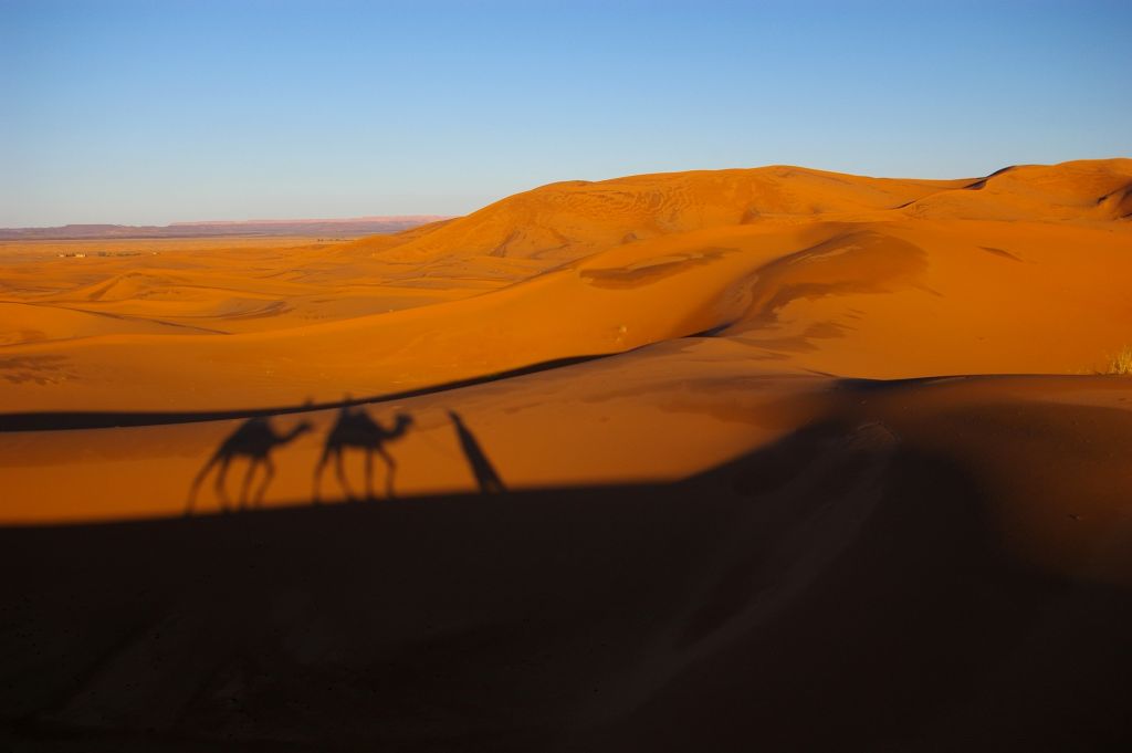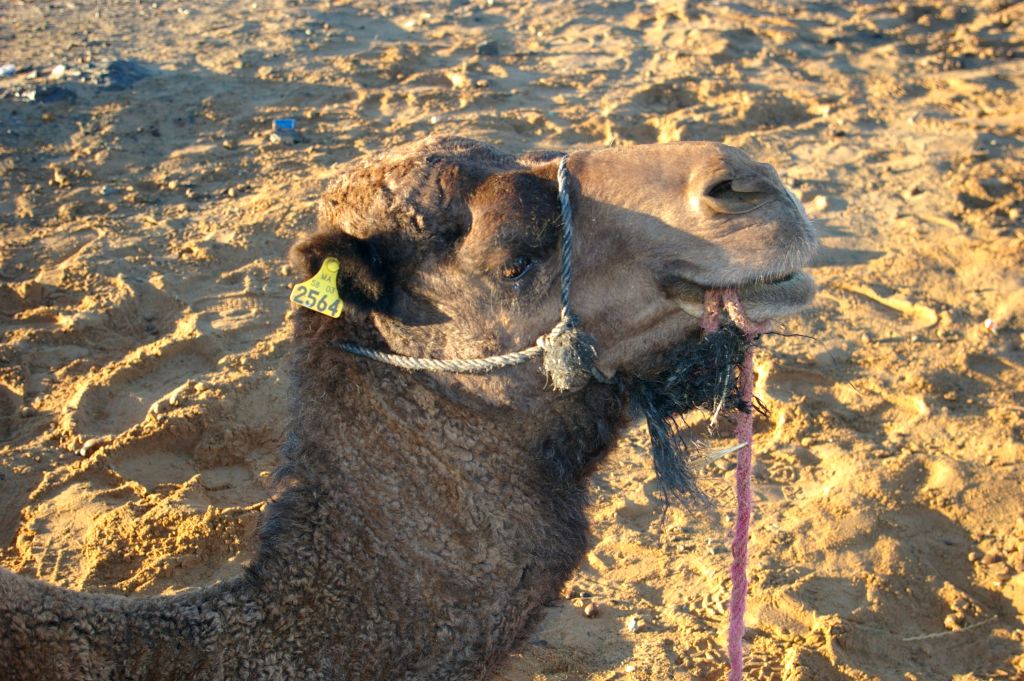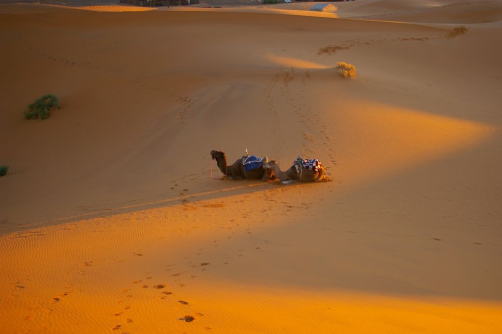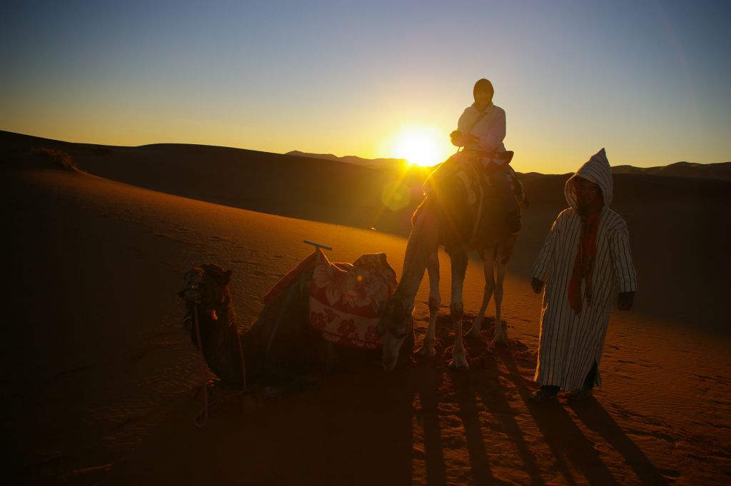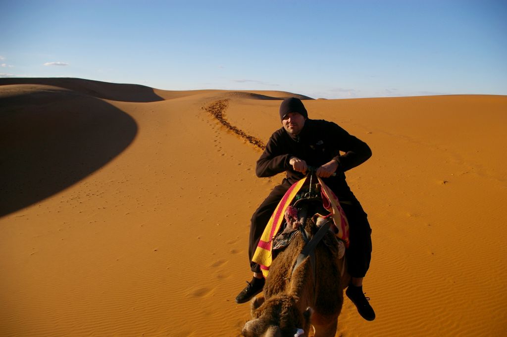 Ok. 4.00 obudziłam się, chyba wiatr mnie zbudził i już widziałam, że jest jasno, no ale Berber dopiero o 5 miał nas obudzić. Tak też zrobił – zebraliśmy całą odwagę, żeby wyjść z namiotu na to zimno i się okazało, że to jeszcze noc, że to księżyc i gwiazdy tak jasno świecą. Dosiedliśmy naszych wielbłądów i ruszyliśmy w drogę powrotną. A zimno było okropnie, żałowałam, że futra nie wzięłam,miałam na sobie 3 ciepłe bluzy, ale to jakby nic nie dawało. I tak jechaliśmy nocą przez pustynię – gdyby nie to zimno, to by całkiem przyjemnie było. Robiło się coraz jaśniej, a my jechaliśmy. Po drodze widzieliśmy karawany, które przyjechały wprost z hotelu na wschód słońca na wydmach. Stanęliśmy i my, Berber rozłożył nam koc i obserwowaliśmy. No fajne to było, kiedy tak słońce wschodząc padało na coraz większe obszary wydm. Porobiliśmy zdjęcia, ale mam za słaby aparat, żeby to oddać.