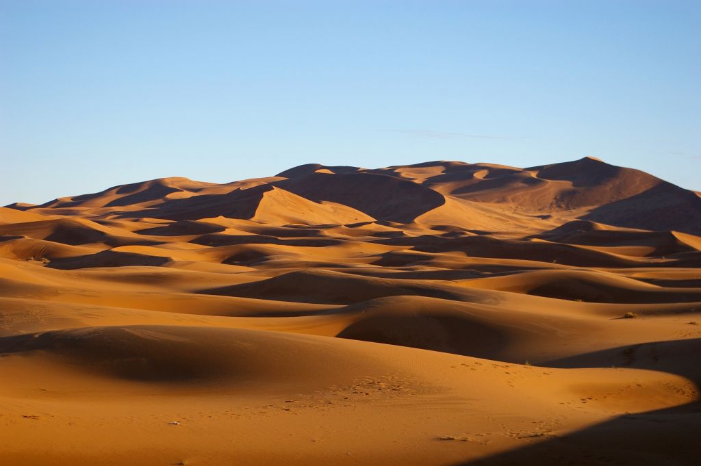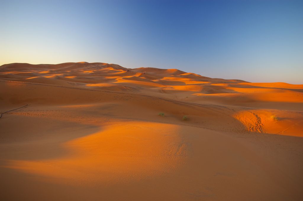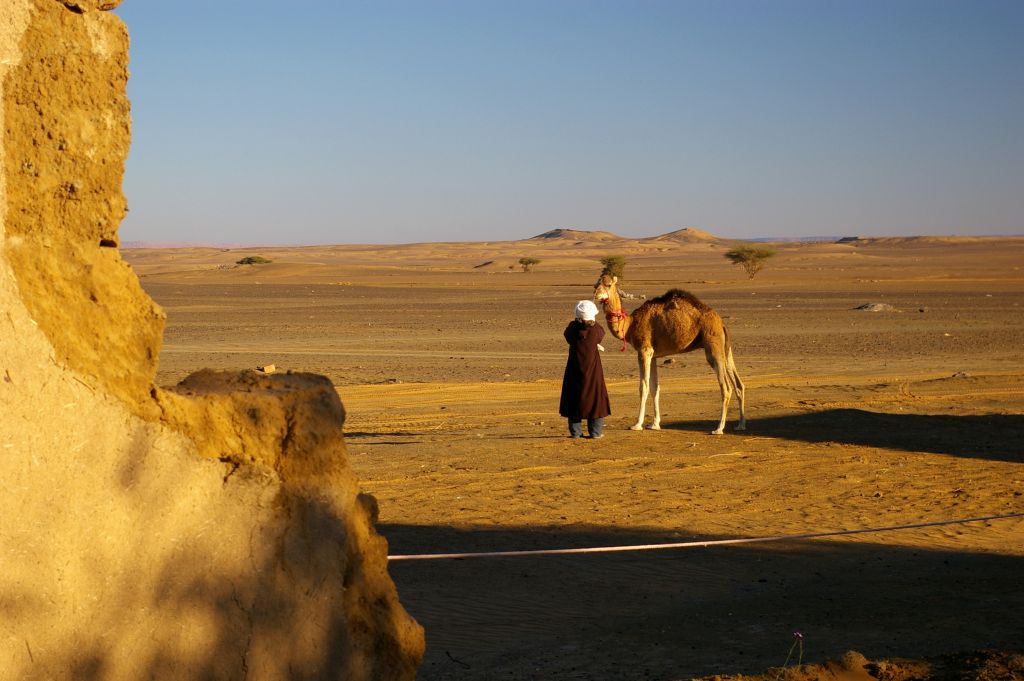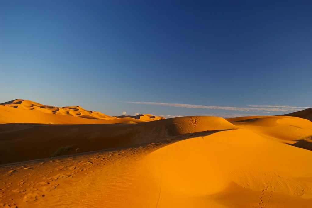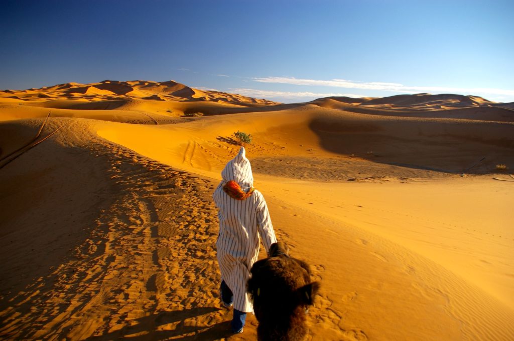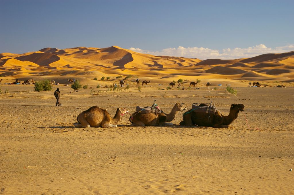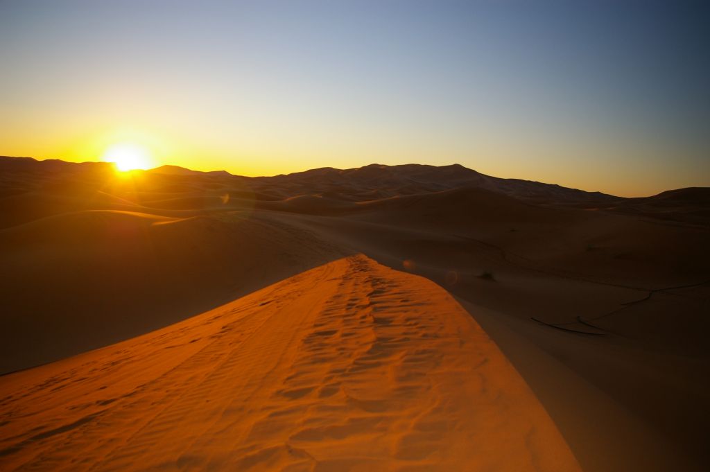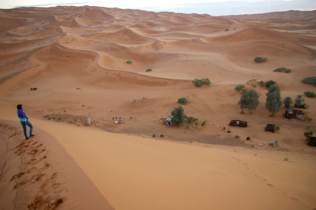 Ok. 4.00 obudziłam się, chyba wiatr mnie zbudził i już widziałam, że jest jasno, no ale Berber dopiero o 5 miał nas obudzić. Tak też zrobił – zebraliśmy całą odwagę, żeby wyjść z namiotu na to zimno i się okazało, że to jeszcze noc, że to księżyc i gwiazdy tak jasno świecą. Dosiedliśmy naszych wielbłądów i ruszyliśmy w drogę powrotną. A zimno było okropnie, żałowałam, że futra nie wzięłam,miałam na sobie 3 ciepłe bluzy, ale to jakby nic nie dawało. I tak jechaliśmy nocą przez pustynię – gdyby nie to zimno, to by całkiem przyjemnie było. Robiło się coraz jaśniej, a my jechaliśmy. Po drodze widzieliśmy karawany, które przyjechały wprost z hotelu na wschód słońca na wydmach. Stanęliśmy i my, Berber rozłożył nam koc i obserwowaliśmy. No fajne to było, kiedy tak słońce wschodząc padało na coraz większe obszary wydm. Porobiliśmy zdjęcia, ale mam za słaby aparat, żeby to oddać.