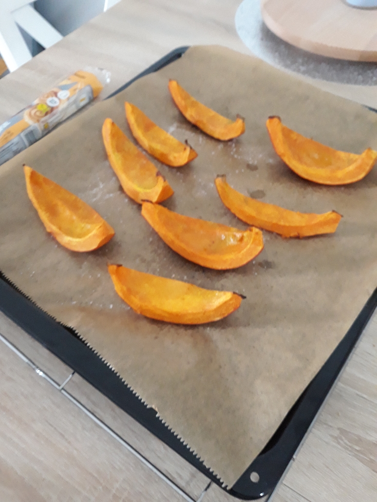 1. Umytą dynię kroimy na większe kawałki, układamy na blasze wyłożonej papierem do pieczenia, skórką do dołu. Lekko skrapiamy olejem, trochę solimy i pieczemy w 190stC ok pół godz. Tak do miękkości. Upieczoną trochę studzimy, kroimy na mniejsze kawałki i wrzucamy do miski czy czegoś, w czym będziemy blendować.