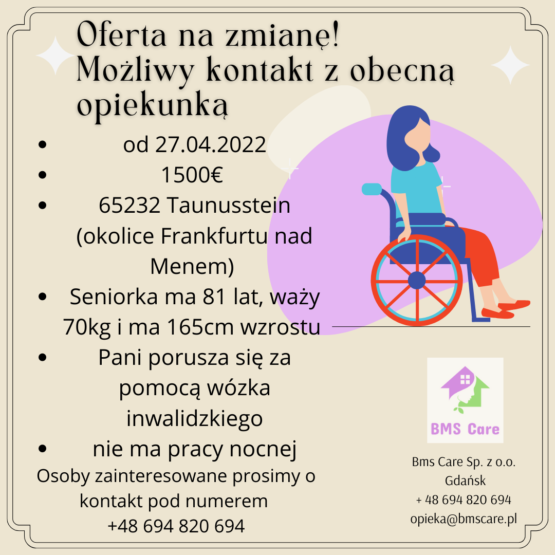 ? Firma BMS Care z Gdańska, zatrudni opiekunkę do starszej Pani w miejscowości Taunusstein.