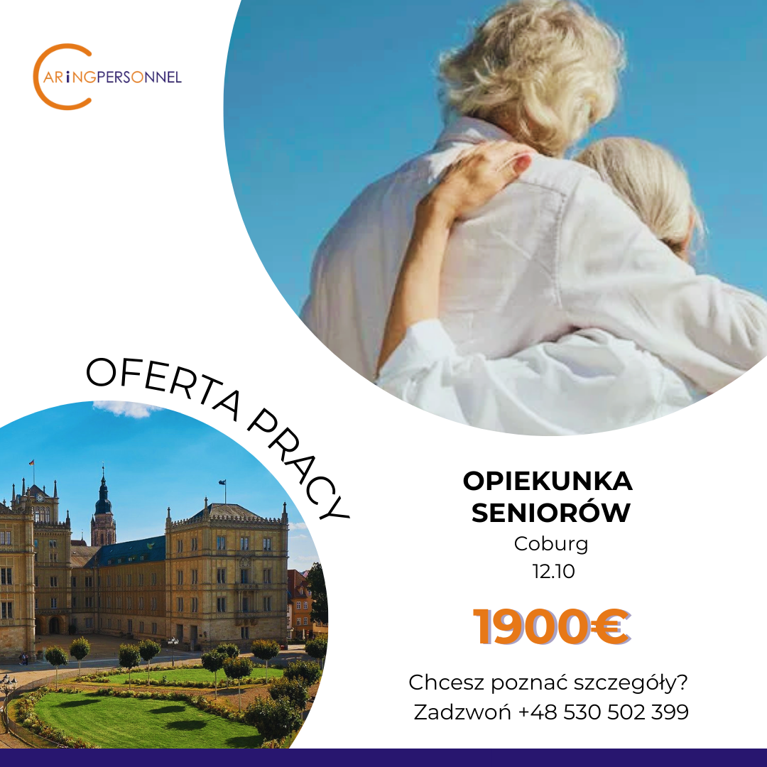 Poszukujemy Pani z komunikatywną bądź dobrą znajomością języka niemieckiego do małżeństwa mieszkającego w willi w pięknej części Coburga. Na miejscu znajduje się również druga, polskojęzyczna opiekunka seniorów, z którą ma się dzielić obowiązki.