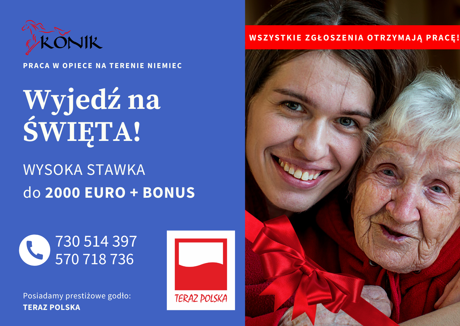 Każda opiekunka która się zgłosi ma gwarancję zatrudnienia i otrzyma PREMIĘ ŚWIĄTECZNĄ