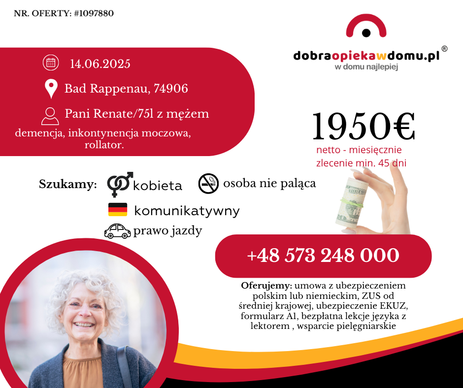 Oferta skierowana do Pań z komunikatywnym lub dobrym językiem niemieckim. Tylko osoby niepalące z prawem jazdy.