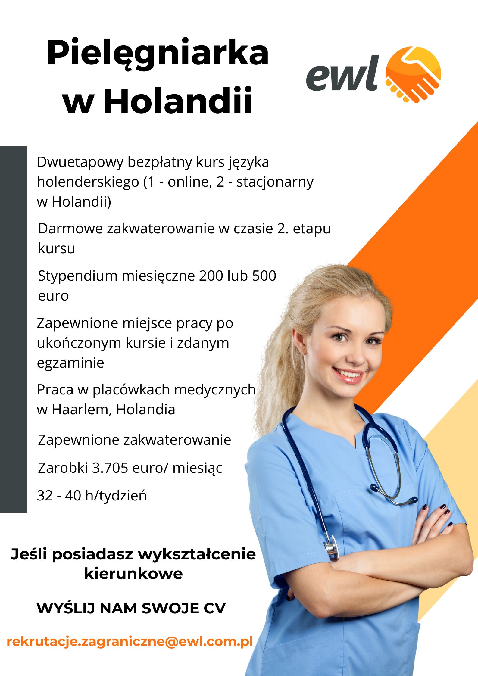 Chcesz połączyć swoją pasję do opieki z przygodą w nowym kraju? Ewl International szuka pełnych energii i zaangażowania pielęgniarek i opiekunów medycznych do pracy w jednym z największych ośrodków opieki zdrowotnej w Kennemerland, Holandia.