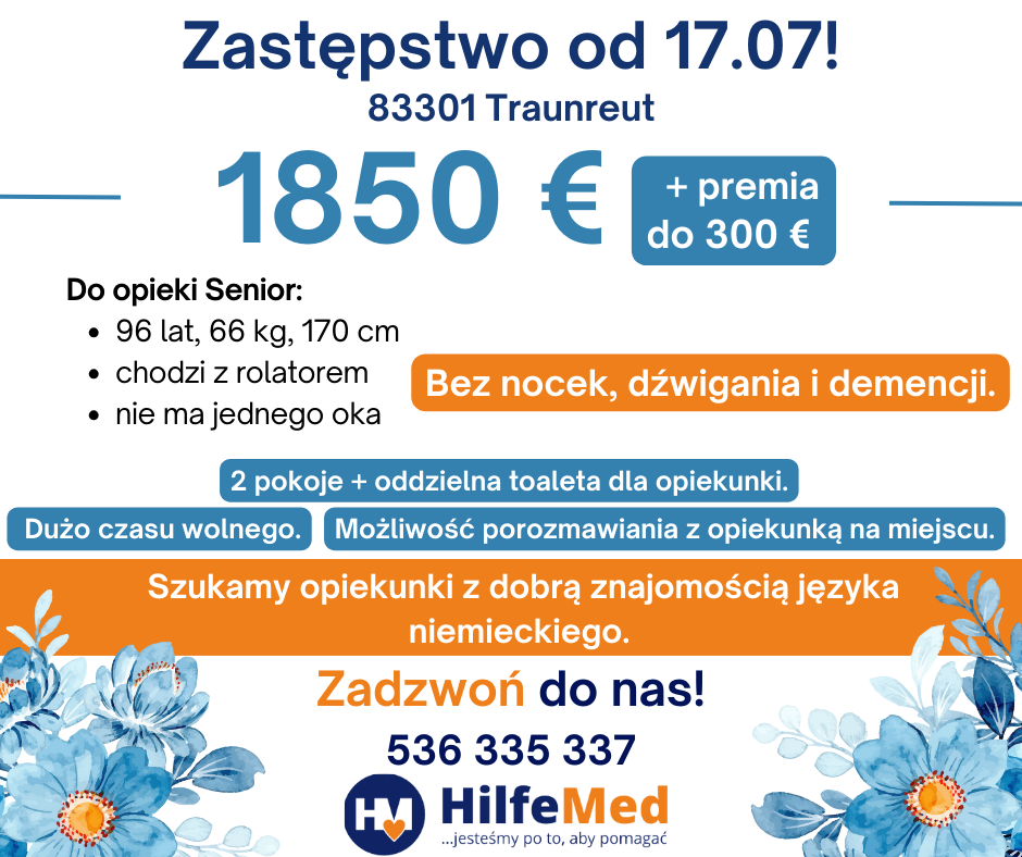 Do opieki 96-letni Senior. Porusza się z rolatorem. Senior nie ma jednego oka. Zlecenie bez nocek i transferu. Senior NIE CHORUJE na demencję. Opiekunka na zleceniu ma dużo wolnego czasu, do Jej dyspozycji 2 pokoje oraz oddzielna toaleta. Można porozmawiać z Panią, która obecnie jest na miejscu. Możliwość zdobycia do 300€ premii. Szukamy Opiekunki z DOBRĄ znajomością języka niemieckiego.