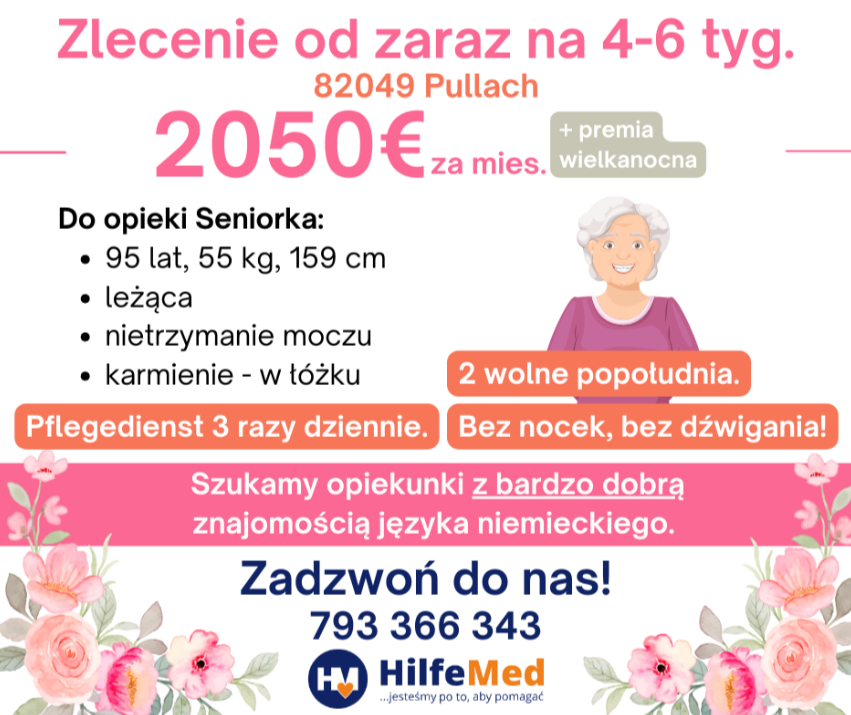 Pielęgnacja odbywa się przy wsparciu Pflegedienst, który przychodzi 3 razy dziennie.
