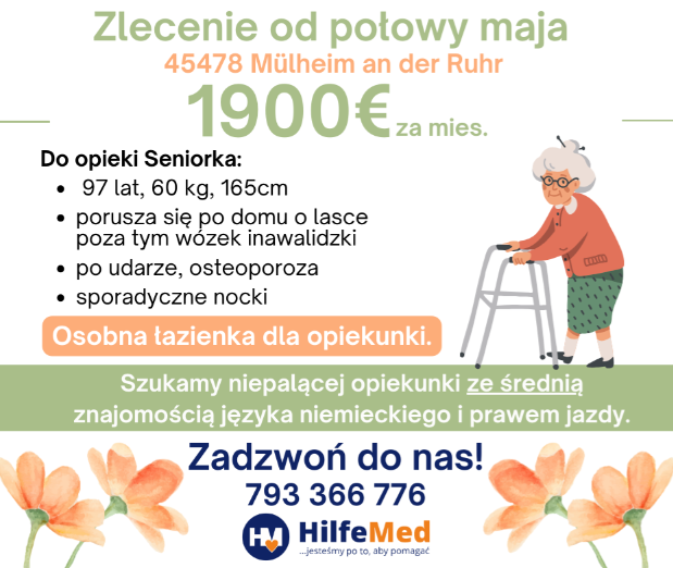Poszukujemy NIEPALĄCEJ opiekunki z PRAWEM JAZDY oraz ŚREDNIĄ znajomością języka niemieckiego.