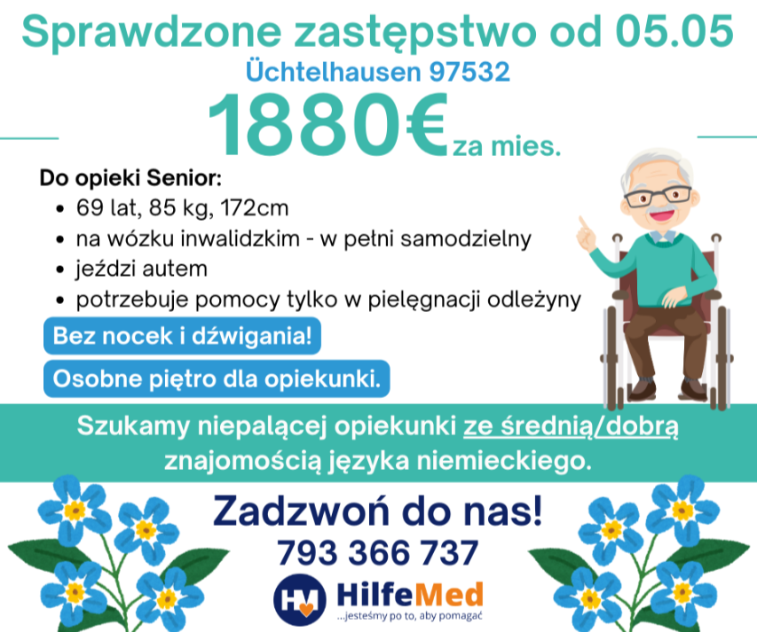 Poszukujemy opiekunki do Seniora poruszającego się na wózku inwalidzkim.