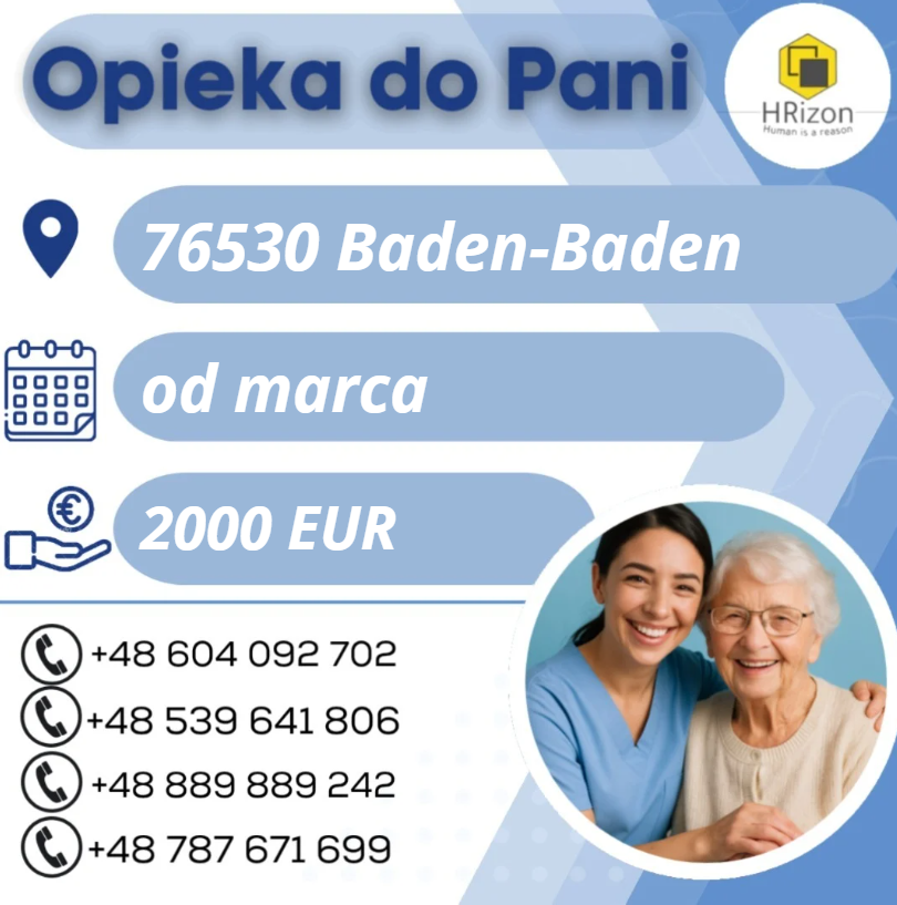 Kontakt: osoby zainteresowane prosimy o kontakt w wiadomości prywatnej lub lub o wysłanie sms o treści: ,,opieka- 76530 Baden-Baden" pod numer: 889889242 - oddzwonimy