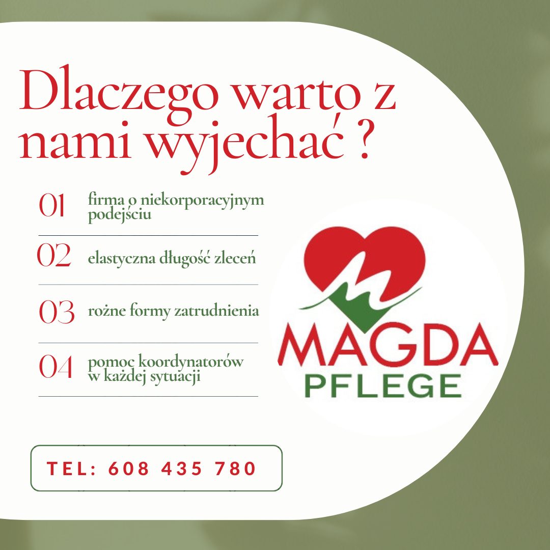 MAGDA PFLEGE sp. z o.o. to agencja pracy z blisko 10-letnim doświadczeniem. Jako firma o ugruntowanej pozycji na rynku od lat współpracujemy wyłącznie z zaufanymi niemieckimi partnerami, stawiając na pierwszym miejscu bezpieczeństwo i komfort naszych pracowników. Wiemy, jak wymagająca bywa praca z osobami starszymi, dlatego dokładamy wszelkich starań, byś nie musiała się o nic martwić. Poszukujemy zaangażowanych Opiekunów, oferując im pełne wsparcie na każdym etapie realizacji zlecenia.