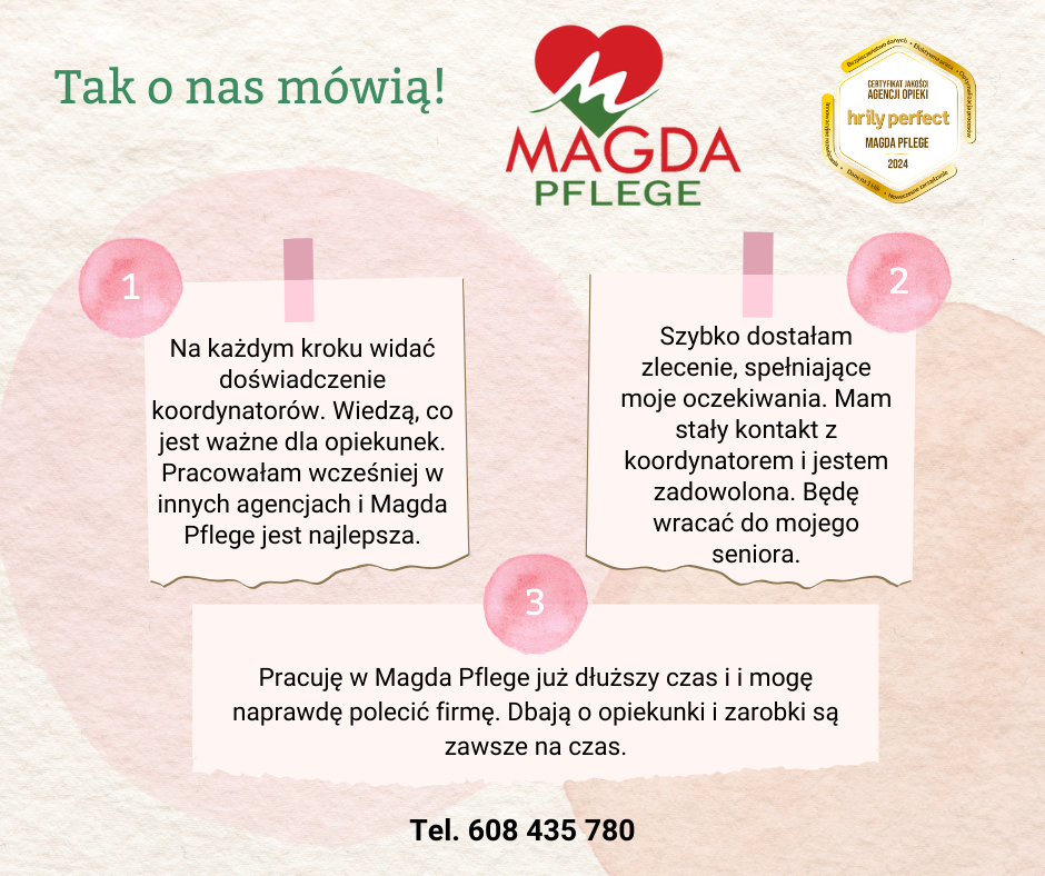MAGDA PFLEGE sp. z o.o. to agencja pracy z blisko 10-letnim doświadczeniem. Jako firma o ugruntowanej pozycji na rynku od lat współpracujemy wyłącznie z zaufanymi niemieckimi partnerami, stawiając na pierwszym miejscu bezpieczeństwo i komfort naszych pracowników. Wiemy, jak wymagająca bywa praca z osobami starszymi, dlatego dokładamy wszelkich starań, byś nie musiała się o nic martwić. Poszukujemy zaangażowanych Opiekunów, oferując im pełne wsparcie na każdym etapie realizacji zlecenia.