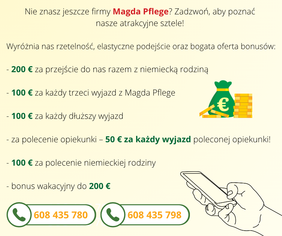 MAGDA PFLEGE sp. z o.o. to agencja pracy z blisko 10-letnim doświadczeniem. Jako firma o ugruntowanej pozycji na rynku od lat współpracujemy wyłącznie z zaufanymi niemieckimi partnerami, stawiając na pierwszym miejscu bezpieczeństwo i komfort naszych pracowników. Wiemy, jak wymagająca bywa praca z osobami starszymi, dlatego dokładamy wszelkich starań, byś nie musiała się o nic martwić. Poszukujemy zaangażowanych Opiekunów, oferując im pełne wsparcie na każdym etapie realizacji zlecenia.