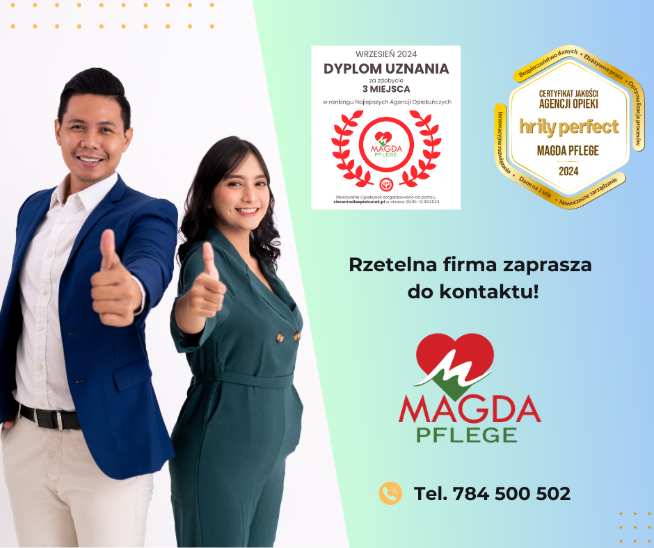 MAGDA PFLEGE sp. z o.o. to agencja pracy z blisko 10-letnim doświadczeniem. Jako firma o ugruntowanej pozycji na rynku od lat współpracujemy wyłącznie z zaufanymi niemieckimi partnerami, stawiając na pierwszym miejscu bezpieczeństwo i komfort naszych pracowników. Wiemy, jak wymagająca bywa praca z osobami starszymi, dlatego dokładamy wszelkich starań, byś nie musiała się o nic martwić. Poszukujemy zaangażowanych Opiekunów, oferując im pełne wsparcie na każdym etapie realizacji zlecenia.
