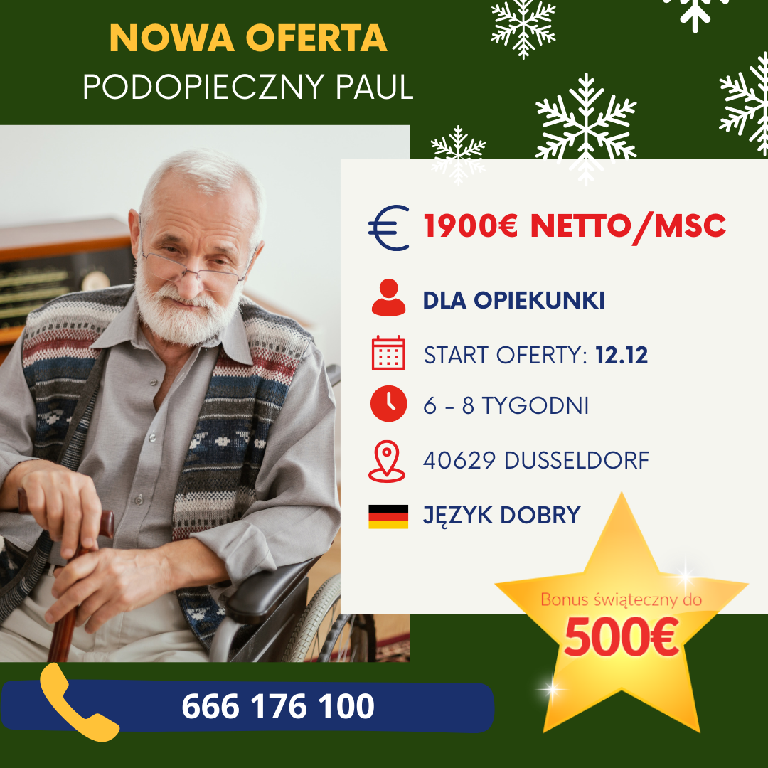 Do opieki Senior w wieku 88 lat (185 cm, 80 kg). Jest po przebytym udarze. Cierpi na cukrzyce i nadciśnienie. Inkontynencja moczowa – pieluchomajtki. Komunikacja – zachowana, orientacja – lekko ograniczona. Podopieczny porusza się przy rollatorze, na zewnątrz na wózku elektrycznym. Do wstawania potrzebuje niewielkiego wsparcia. Przesypia noce.