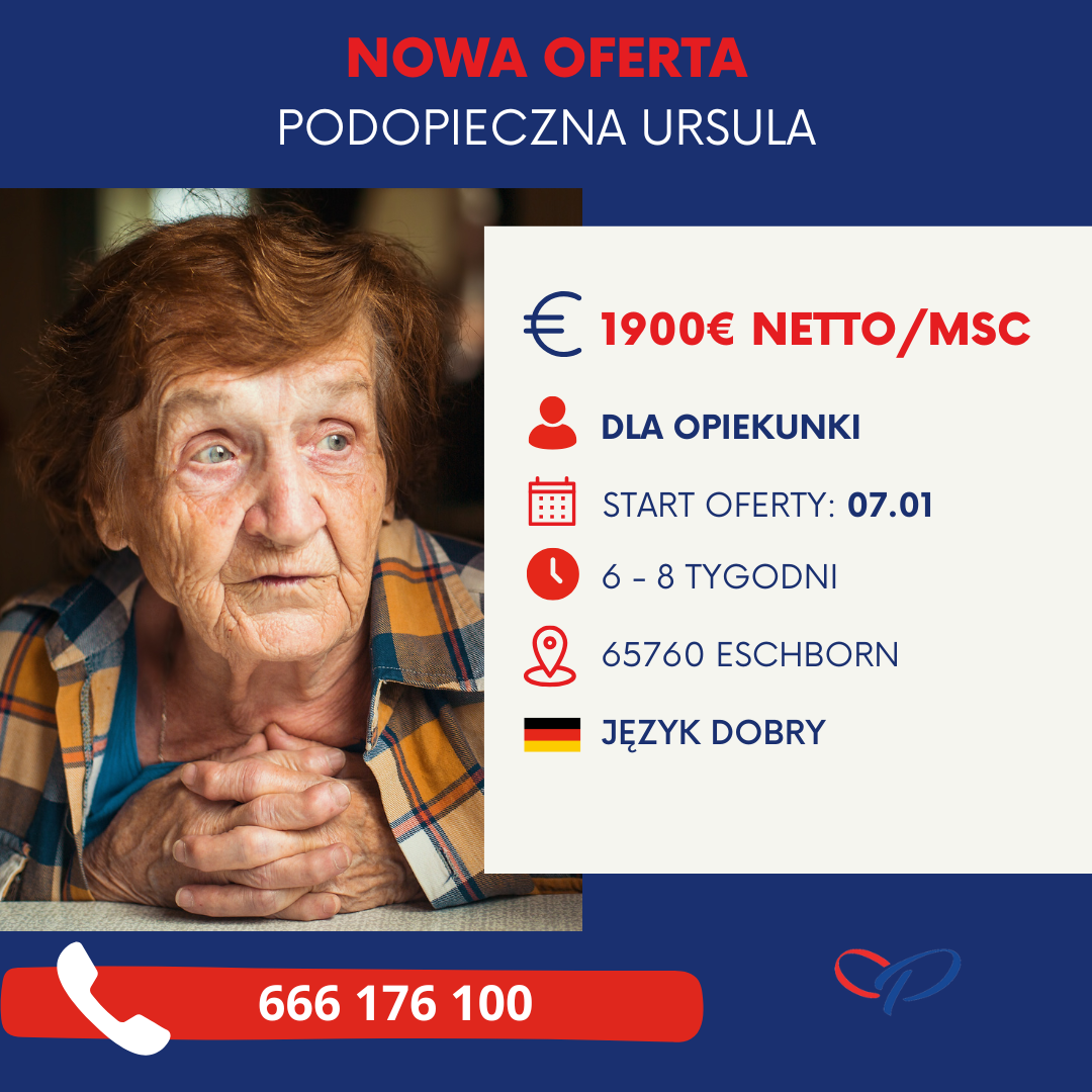 Do opieki Seniorka w wieku 81 lat (165 cm, 66 kg). Choruje na polineuropatie, demencje, astmę i choroby układu krążenia. Inkontynencja moczowa – pieluchy. Porusza się na wózku inwalidzkim, wymaga wsparcia przy wstawaniu. Do dyspozycji łóżko specjalistyczne. Budzi się nocą, lecz pomoc tylko w razie nagłego wypadku.