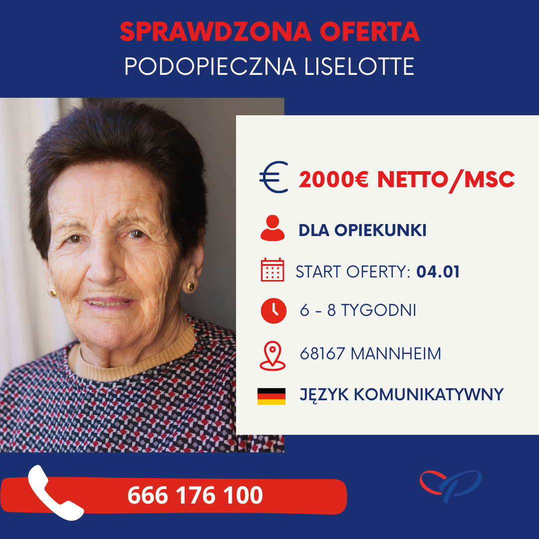 Do opieki Seniorka w wieku 90 lat (164cm, 58kg). Choruje na demencje, depresje oraz inkontynencje. Jest po przebytym udarze oraz ma problemy z sercem. Komunikacja – zachowana, orientacja – częściowo zaburzona. Porusza się z pomocą Opiekunki, bądź rollatora. Nie wymaga transferu, lecz może wymagać wsparcia przy wstawaniu. Czasami wymaga pomocy nocą przy skorzystaniu z toalety.