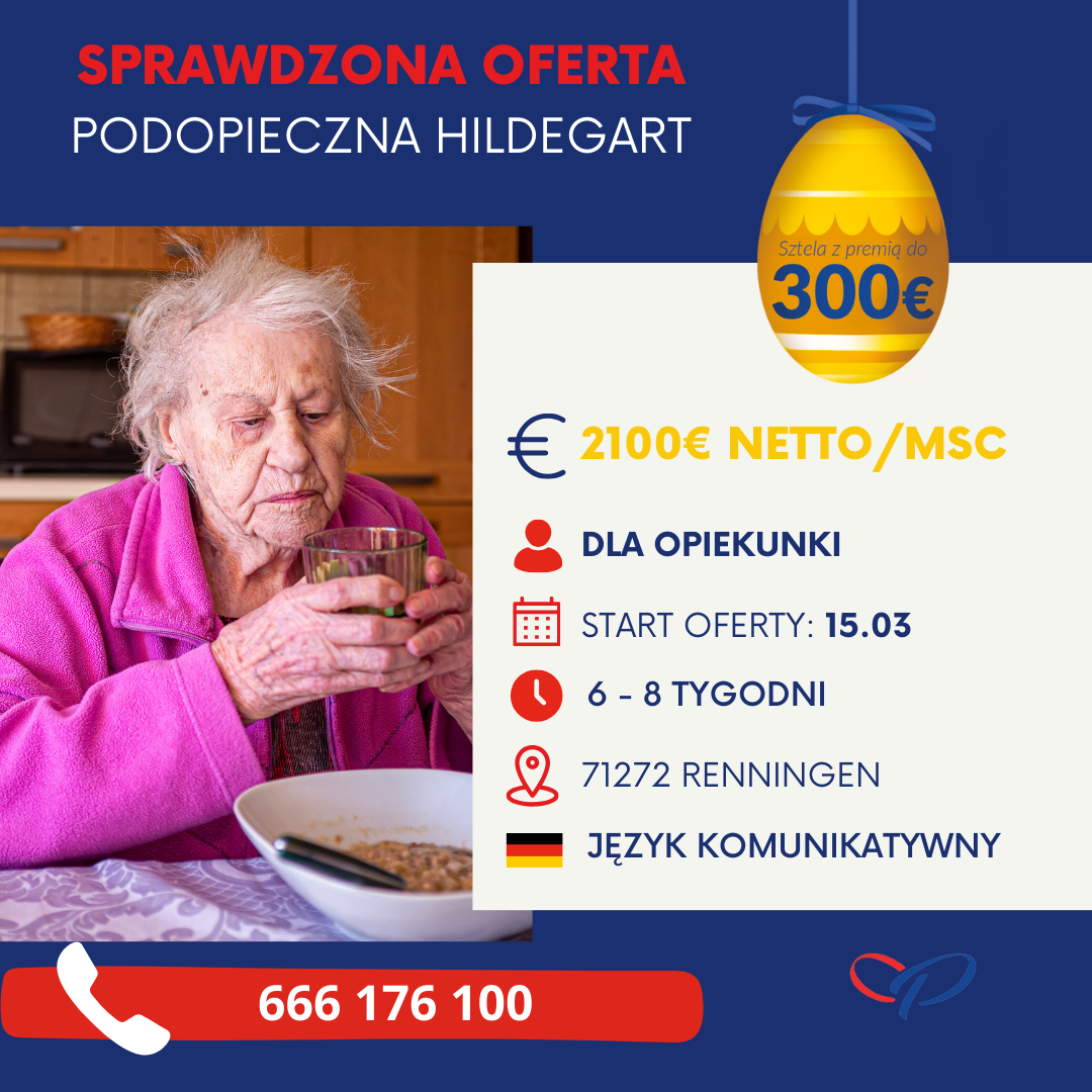 Podopieczna wymaga pomocy przy czynnościach higienicznych i dnia codziennego. Codziennie rano przychodzi Pflegediest do higieny ciała. Raz w tygodniu chodzi do opieki dziennej.